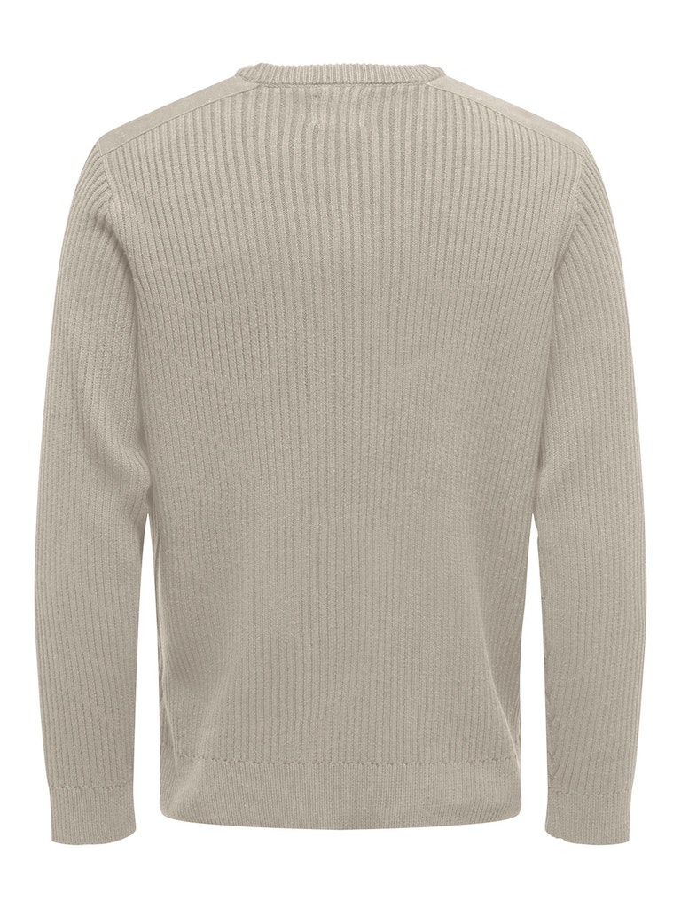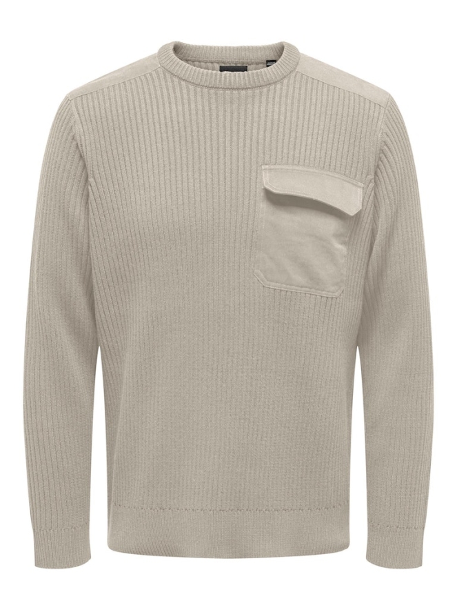 Herentrui met ribbreipatroon en een ronde hals. Op de linker borst zit een klepzak. Deze trui is gemaakt van gerecycled katoen.