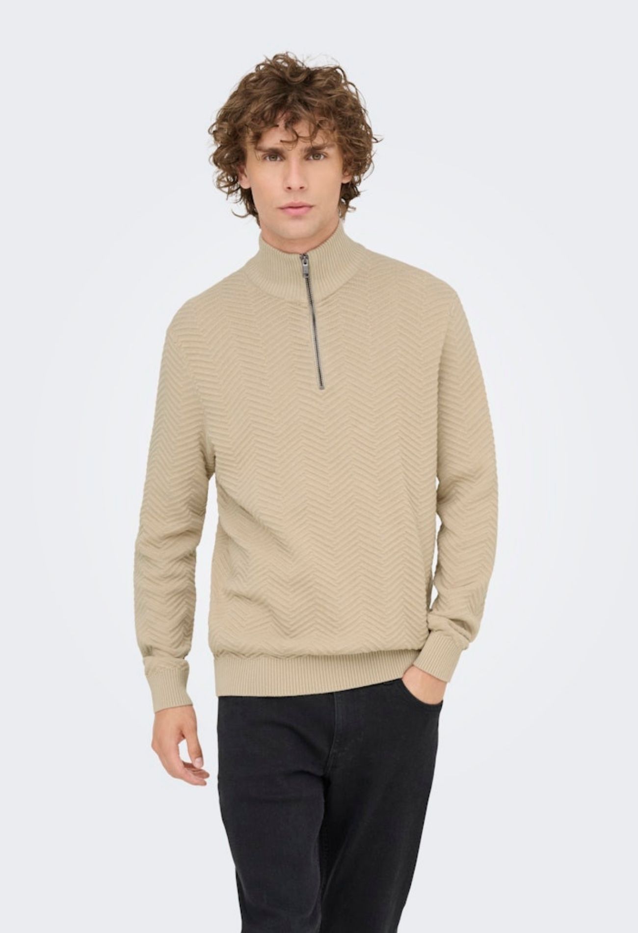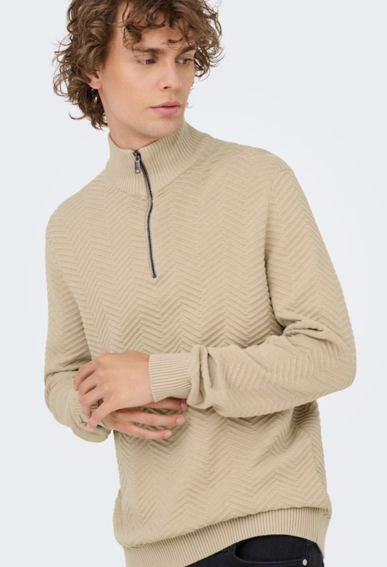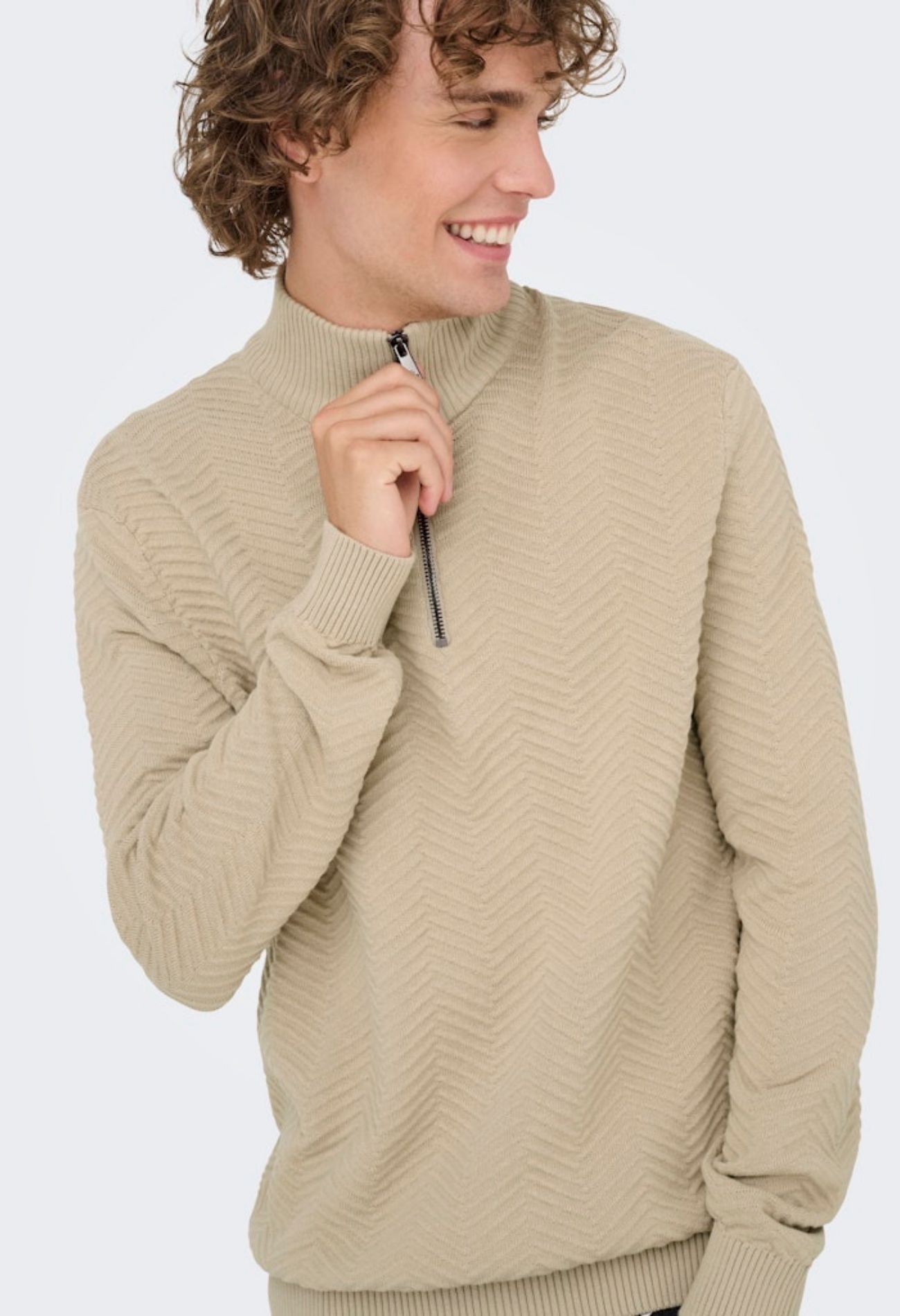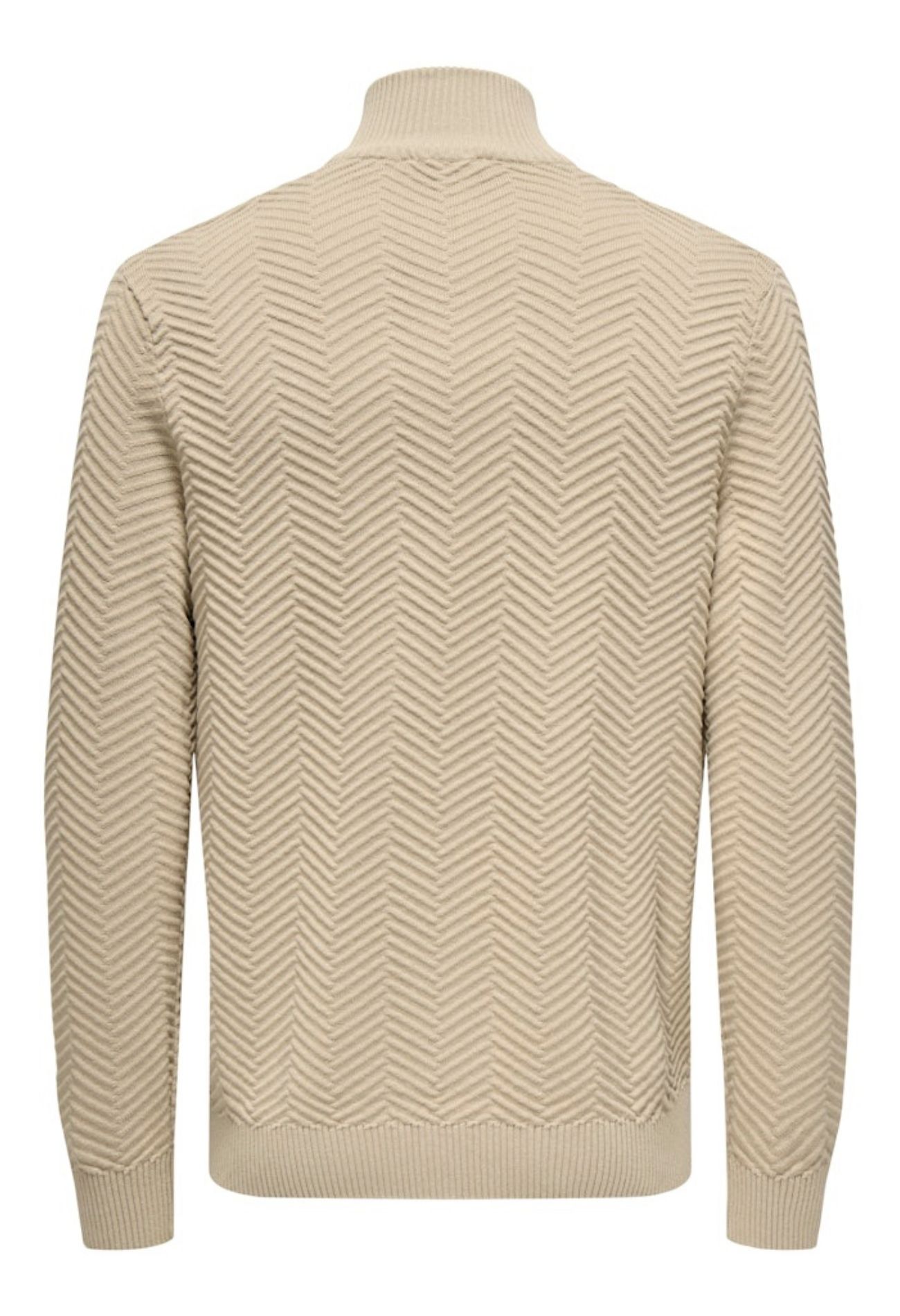Deze 100 procent katoenen trui is niet de dikste maar wel een mooie! In de stof zit een zigzag motief. Daarnaast is hij comfortabel en warm door de hoog sluitende hals met rits. Lekker praktisch!