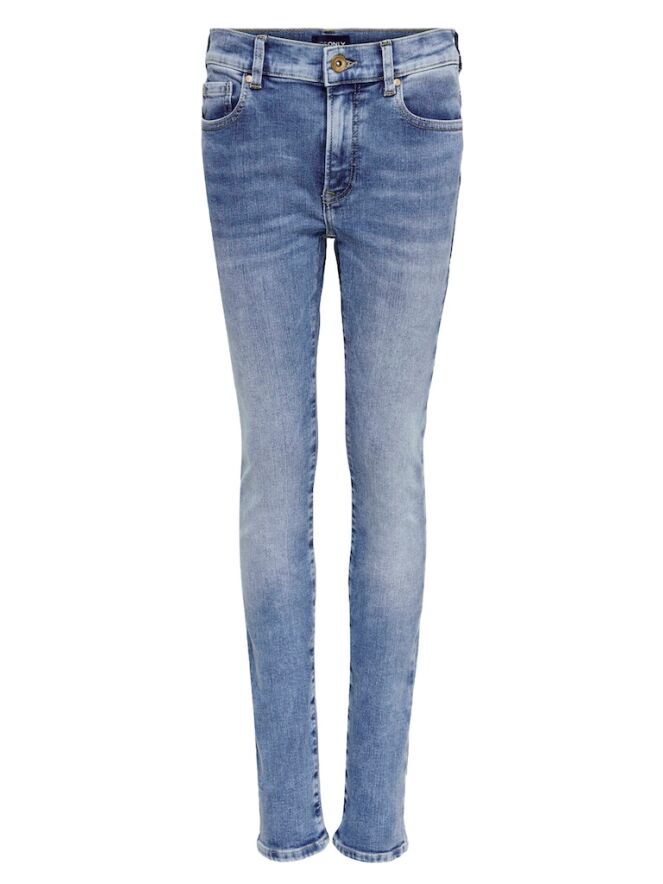 Denim jeans van Only Kids. De jeans heeft een rechte pas vorm en een gebleekte look. Materiaal: 93% katoen, 5% elasthan. Wassen op 30 graden, niet bleken, niet in de droger, kan gestreken worden.