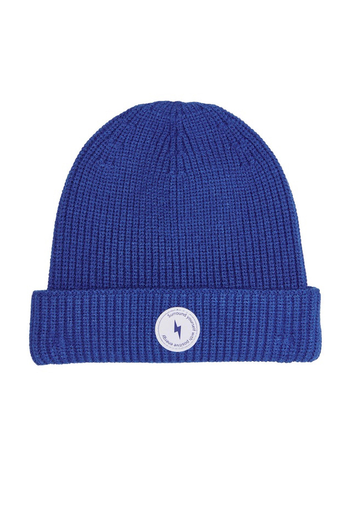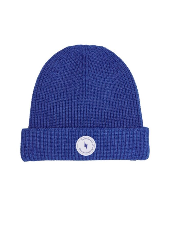 Deze beanie muts is gebreid en heeft een badge op de voorkant met tekst.