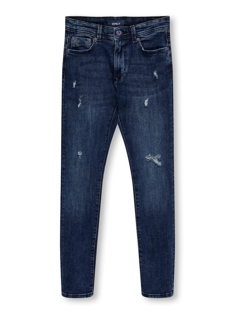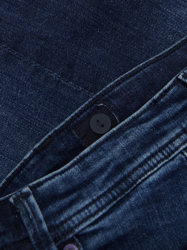 Deze fivepocket tapered jeans heeft in de taille een elastiek om de taille strakker te maken. De jeans heeft een knoop/rits sluiting.