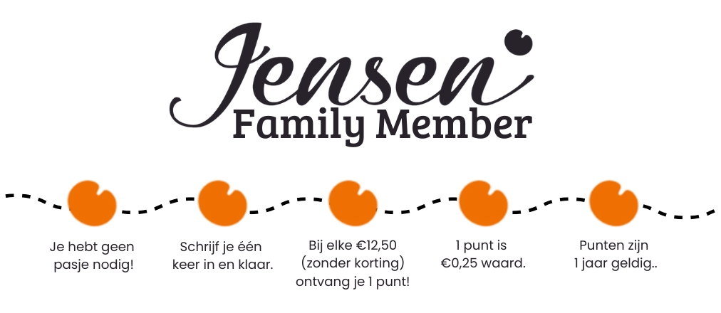 Ben jij een vaste klant bij Jensen Family Shop? Registreer je dan als Jensen Family Member en spaar bonuspunten bij veel van je aankopen. Dat betekent veel extra voordeel voor jou, zowel online als in onze winkels!
