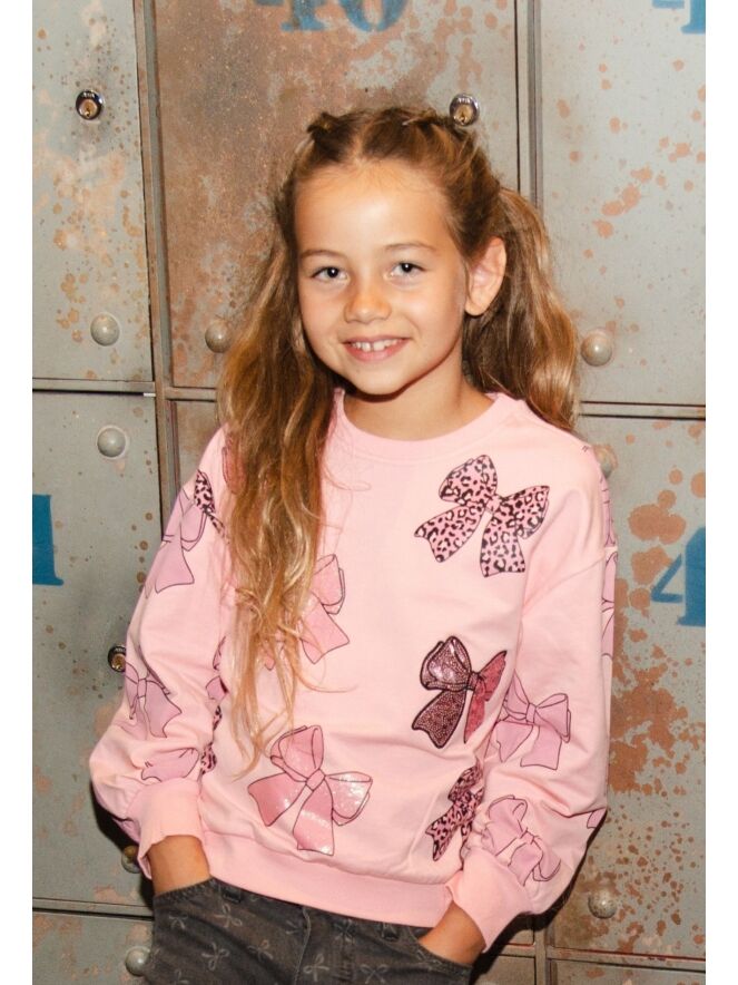 Deze heerlijke, superzachte sweater voor meisjes heeft een all-over print met schattige strikjes die echt de aandacht trekken! De achterkant is lekker rustig met een effen kleur, maar de voorkant is het echte feestje: strikjes met glitters, pailletten en een vleugje panterprint. Perfect voor een trendy en speelse look!