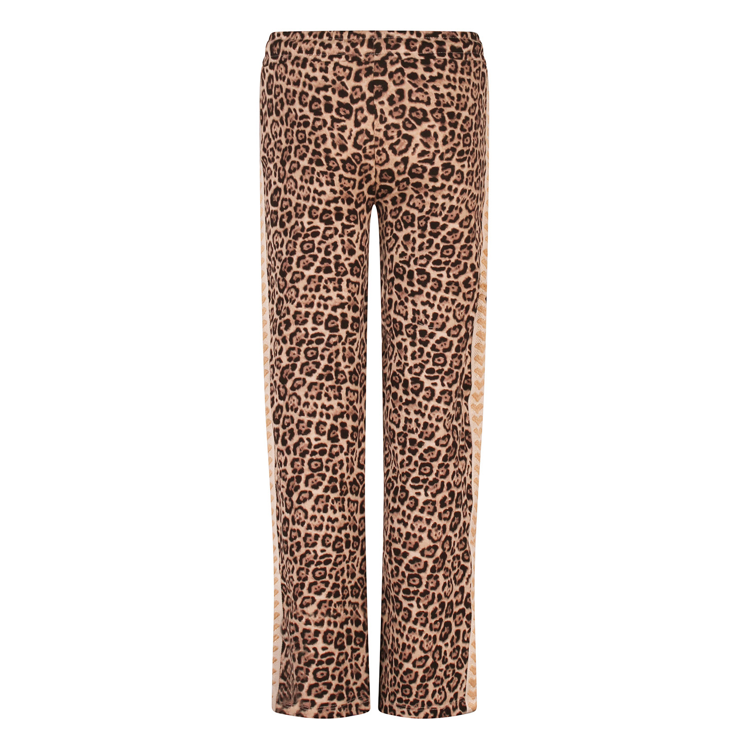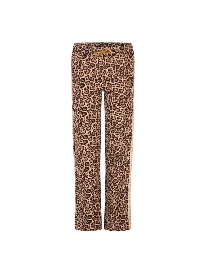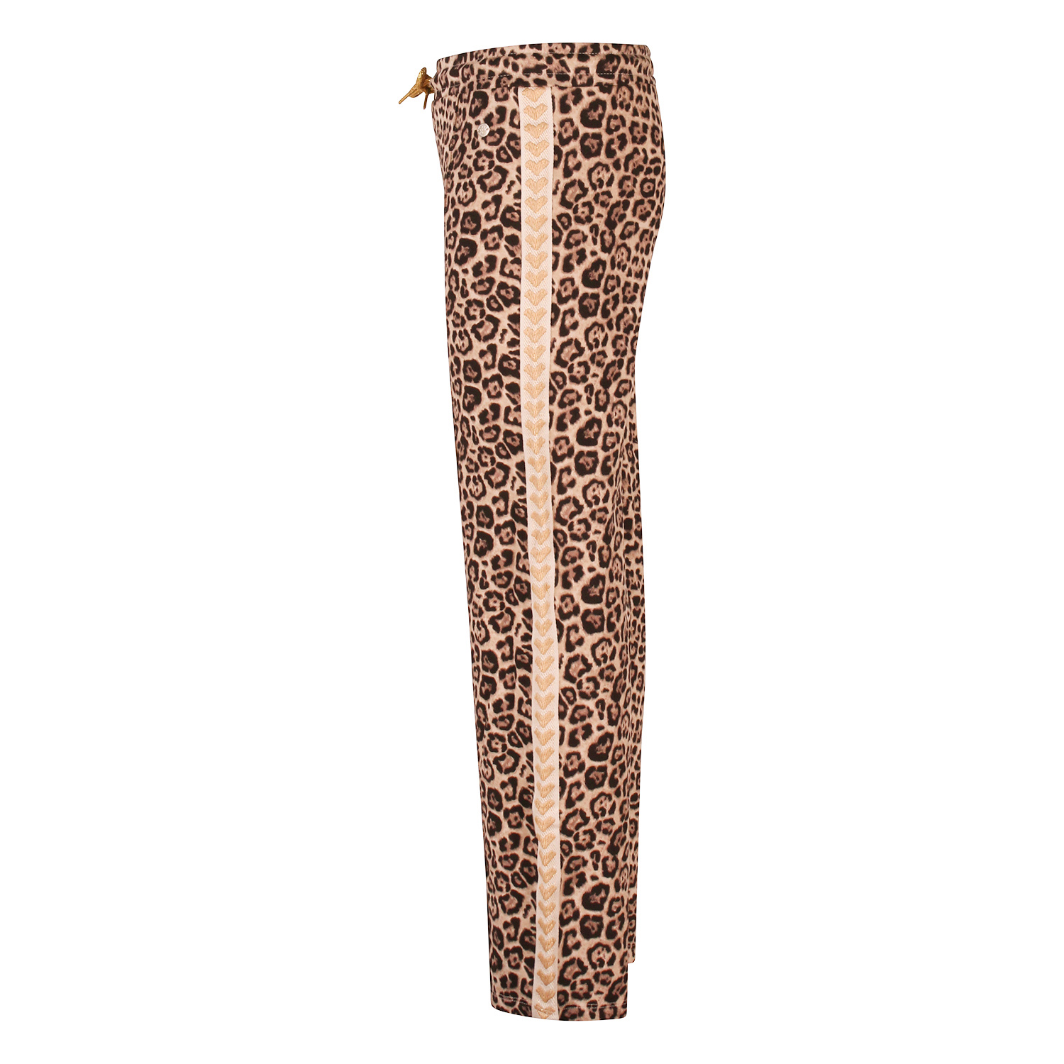 Trendy broek met mooie sierbies met goudkleur hartjes langs de pijp. Deze sweatpant heeft een opvallende panterprint. Hou je van een panterpak? Dan adviseren we je om ook te kijken bij het pantervest met art.nr. W10040.