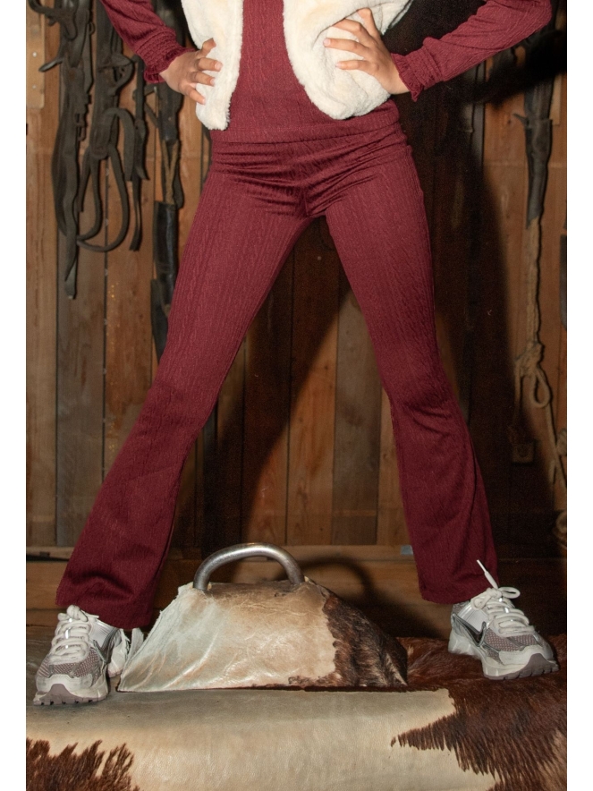 Het flairmodel geeft de broek een speelse, modieuze uitstraling, terwijl het subtiele structuurtje in de jacquardstof zorgt voor een luxe afwerking. De zachte stof draagt comfortabel en beweegt soepel mee. Perfect om in te spelen en stralen. Combineer met de bijpassende top voor een feestelijke look, of draag met een warme trui voor een cozy, stijlvolle outfit op koudere dagen.