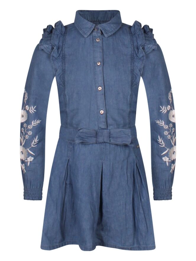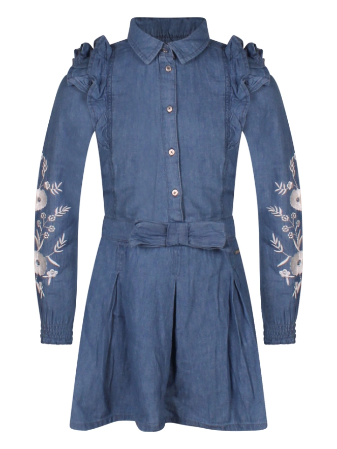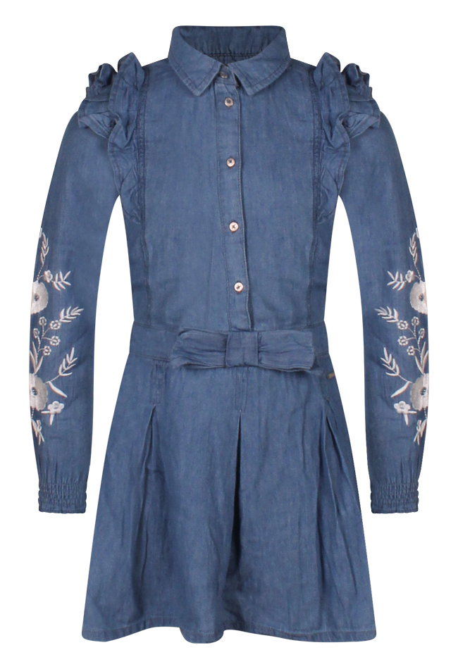 De ruches lopen speels van de voorkant naar de achterkant, met een schattige strik op de voorkant en bloemen geborduurde op de mouwen. Combineer met een legging of maillot voor een outfit.