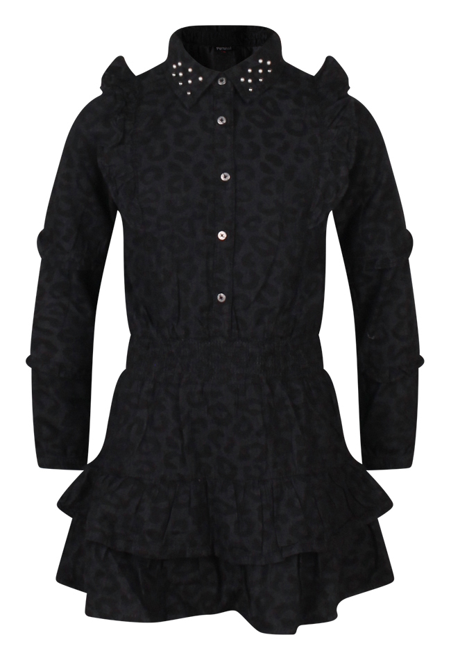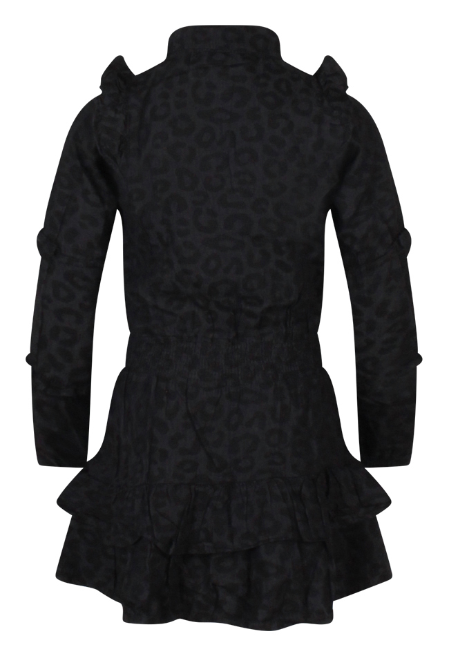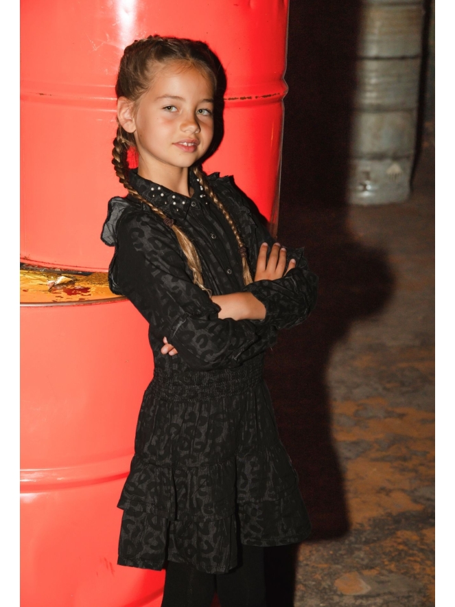 Dit chambray jurkje voor meisjes combineert een stoere uitstraling met lieve details. Het subtiele panterdessin geeft het jurkje een trendy look, terwijl de ruches die van de voorkant naar de achterkant lopen zorgen voor een speels silhouet. De kraag is versierd met stoere parels, wat een verrassend detail toevoegt dat het jurkje net dat beetje extra geeft. De smockband in de taille zorgt voor een comfortabele en flatterende pasvorm.