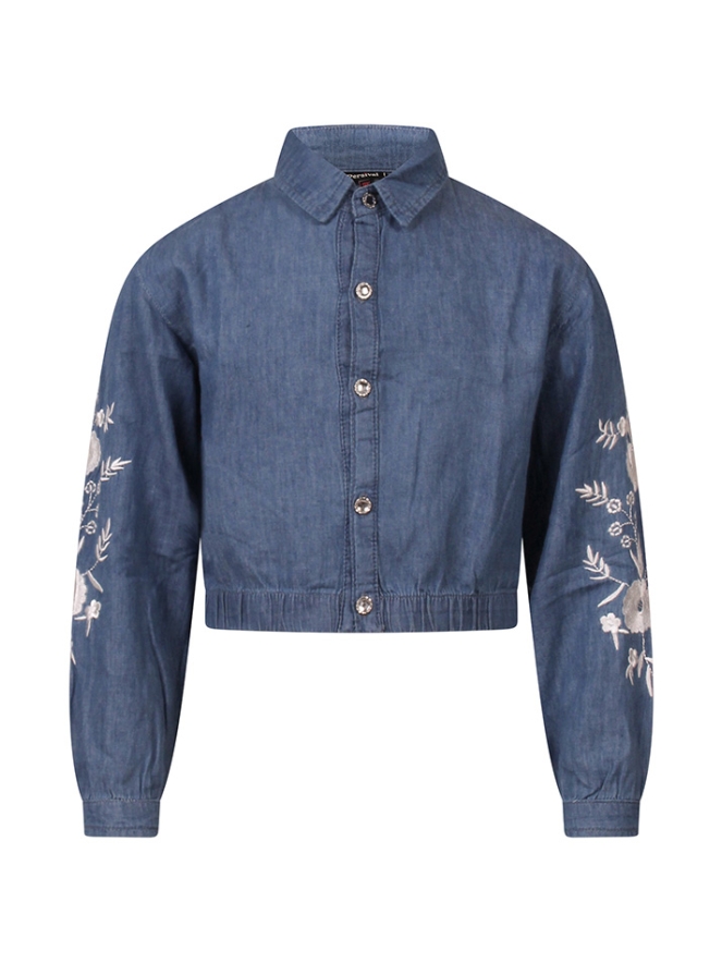 Hou je van denim? Dan hebben we een prachtige blouse! Deze dunne denim blouse heeft mooie glim knopen, geborduurde bloemen op de mouw en elastiek in de taille. Let op, dit is een iets korter model.