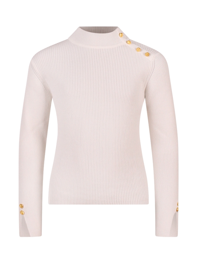 Sjiecke trui met lekker veel stretch! Deze trui met een heerlijk omsluitende turtleneck heeft glimmende goudkleurige knopen op het uiteinde van de mouw en aan een kant van de hals. Draag hem op een jeans met wijde pijpen voor een leuke style met een twist!