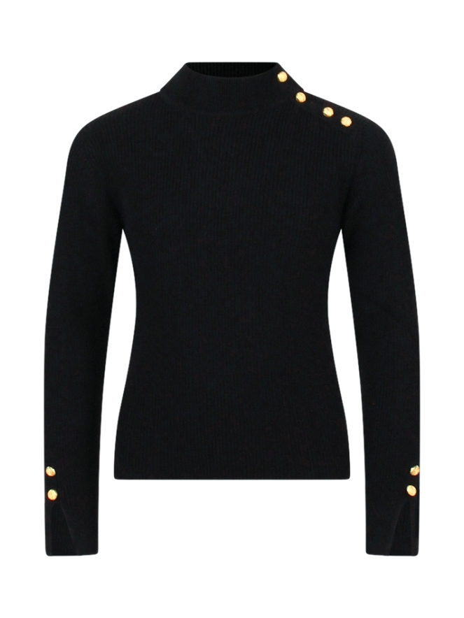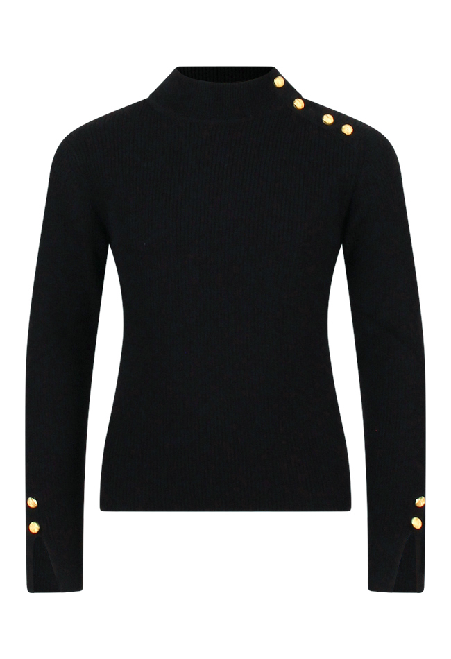Sjiecke trui met lekker veel stretch! Deze trui met een heerlijk omsluitende turtleneck heeft glimmende goudkleurige knopen op het uiteinde van de mouw en aan een kant van de hals. Draag hem op een jeans met wijde pijpen voor een leuke style met een twist!
