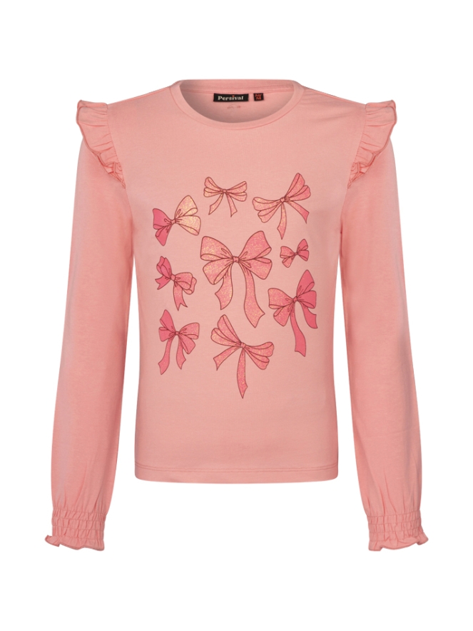 Dit schattige shirt met lange mouwen voor meisjes heeft een glitter strikken print. De mouwen zijn afgewerkt met smokwerk voor een elastische fit en de ruches over de schouder geven het shirt een extra vrolijke uitstraling. Perfect voor een mix van comfort en stijl!