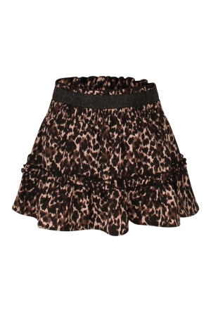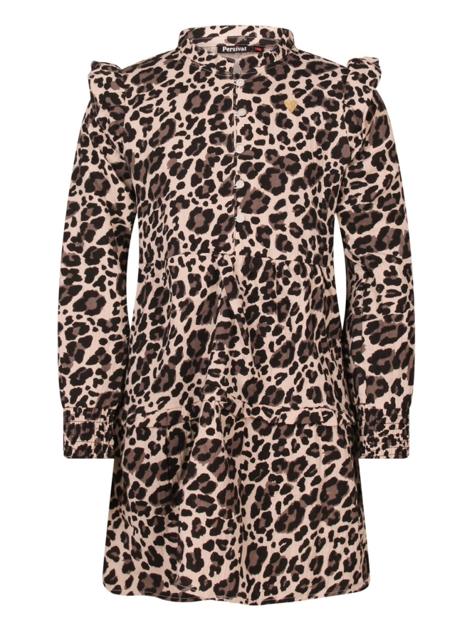 Deze meisjesjurk van luchtige mousseline is versierd met een trendy panterdessin en speelse ruches. Combineer de jurk met een maillot en een gilet voor een extra leuke en comfortabele look.