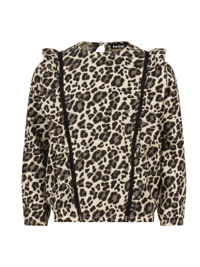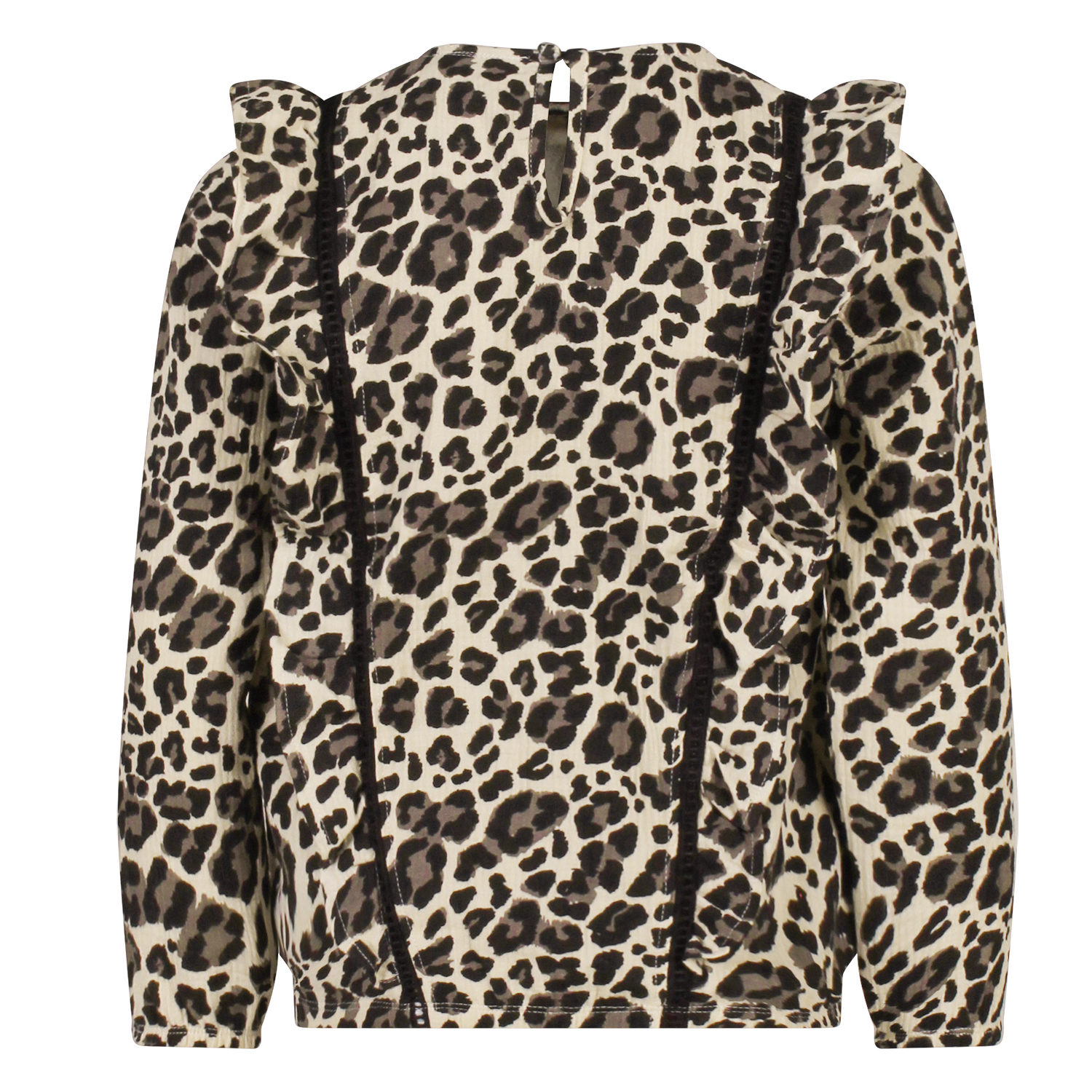 Opvallende 100% katoenen mousseline top met mooie panterprint. Deze top heeft van voor tot achterop een sierbies en mooie ruches wat zorgt voor een speels effect.