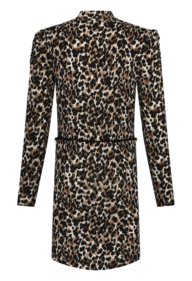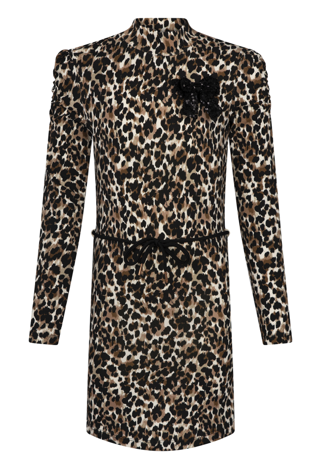 Roarrrr! Dit leuke panterjurkje heeft een turtleneck, riempje om de middel en een leuk pailletten strikje! Hou je niet van koordjes om de middel dan kan hij er ook gewoon af. Zwarte legging eronder met een warme winterschoen en je outfitje is klaar!