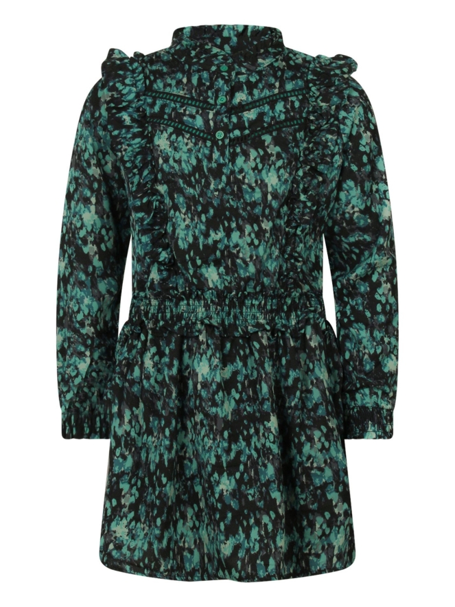Dit meisjesitem van luchtige crepe stof is versierd met een kleurrijk confettidessin en krijgt extra charme door de ruches en smockdetails. Perfect voor feestelijke gelegenheden, maar ook leuk om casual te combineren voor een vrolijke look.