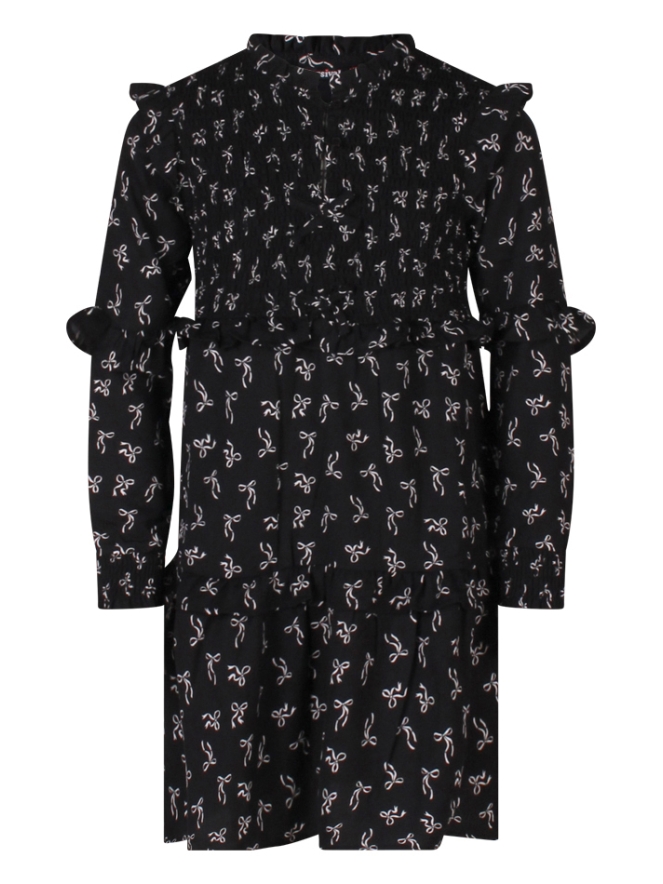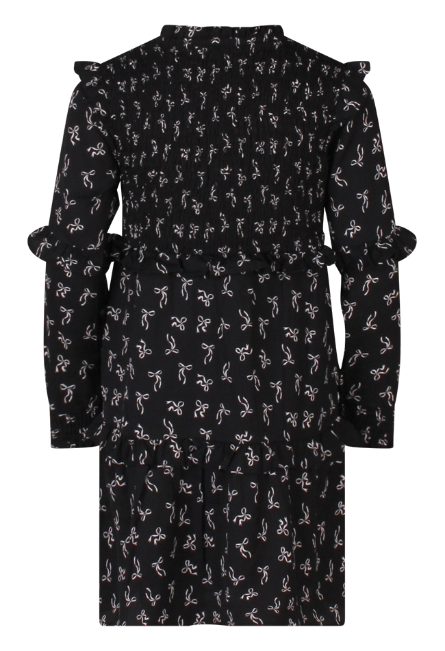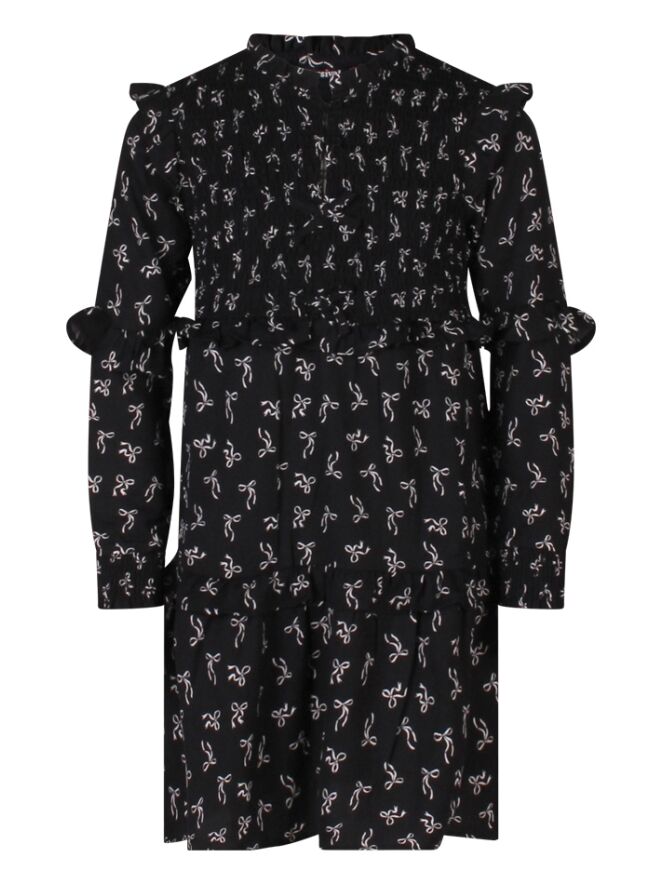 Hoe leuk is deze jurk met een all-over strikkenprint! De top is gemaakt van smockwerk, wat zorgt voor een elastische en comfortabele pasvorm. Op de schoudernaad loopt een speelse ruche, die het jurkje extra charmant maakt. Draag er een maillot onder en een stoer laarsje, en je dochter is helemaal klaar om de deur uit te gaan.