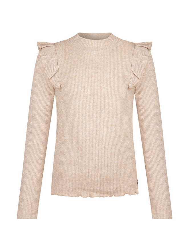 Deze meisjes top is gemaakt van zachte ribbrei met een vleugje lurex voor een subtiele glans, perfect voor speciale gelegenheden. De top heeft een comfortabele turtleneck en schattige ruches op de schouder voor een speels detail. Combineer met een bijpassende rok of broek voor een complete outfit.