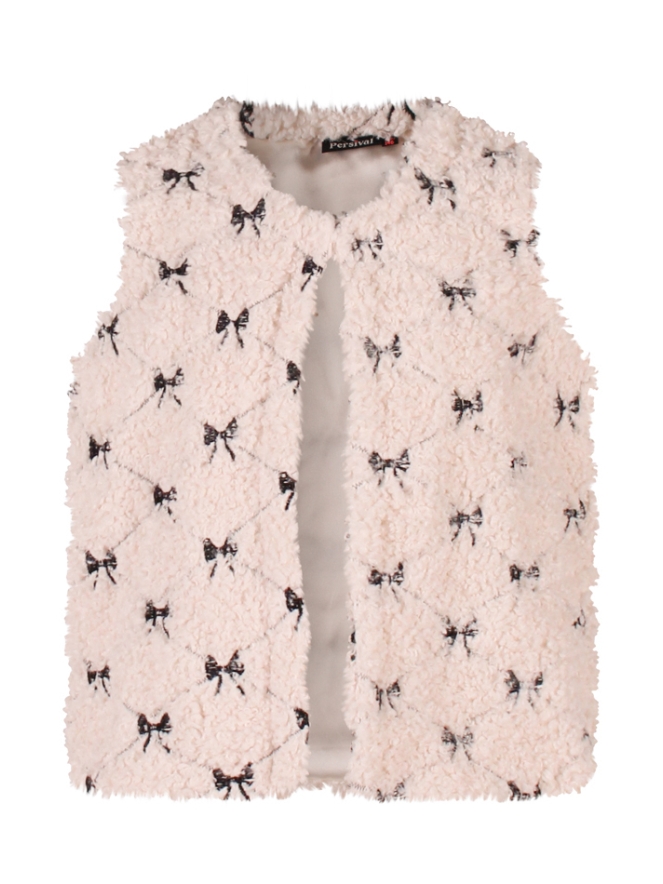 Vrolijk teddy giletje met een strikjesborduursel. Dit giletje kan bovenin vastgezet worden. Leuk over een shirtje op een rokje of spijkerbroek!