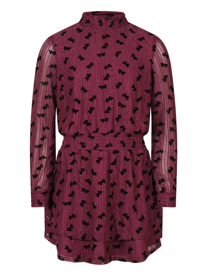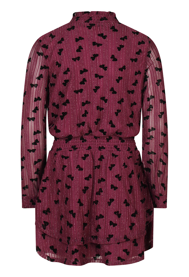 Dit meisjesjurkje is gemaakt van mesh met een subtiele lurex voor een feestelijke glans. Het jurkje heeft strikjes en gesmockt werk in de taille, hals en uiteinden van de mouwen voor een comfortabele pasvorm en schattige details. Perfect voor speciale gelegenheden of feestjes.