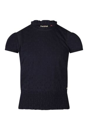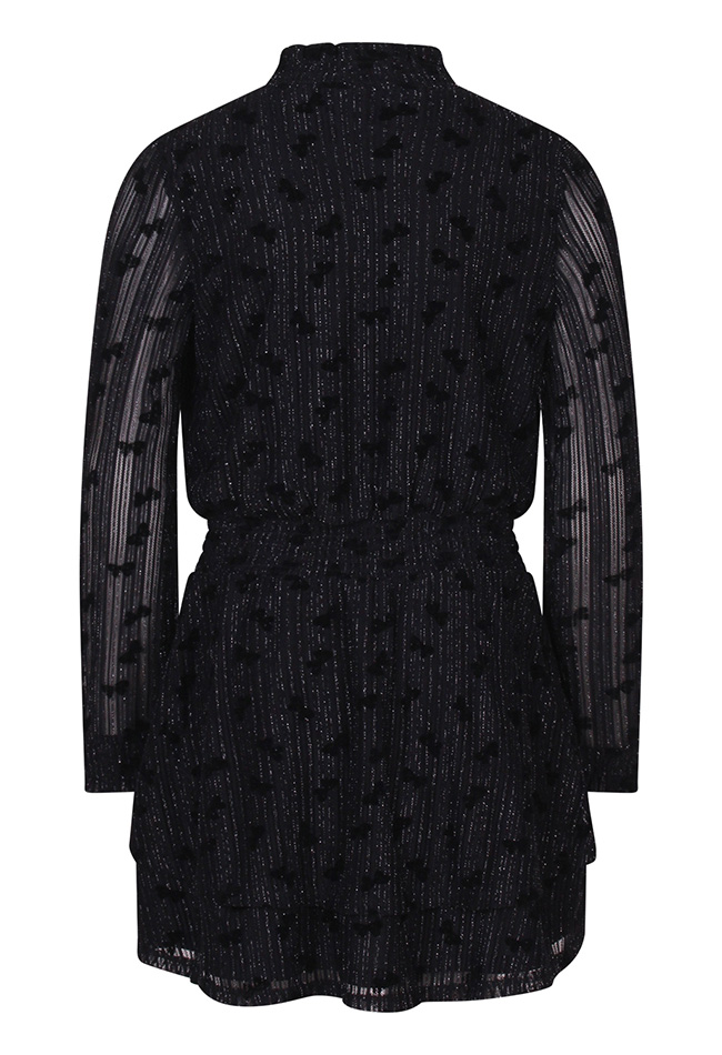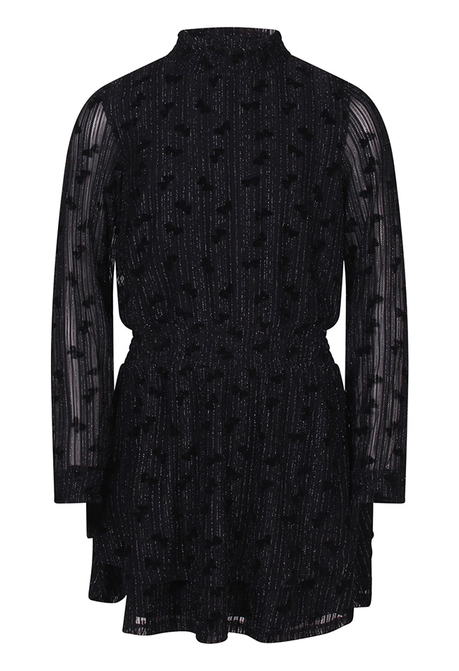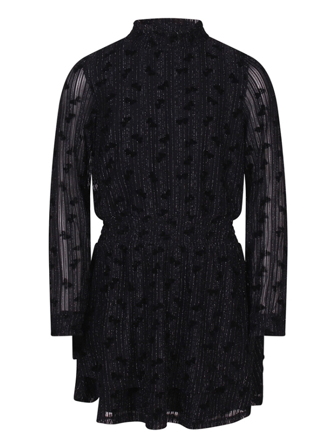 Dit meisjesjurkje is gemaakt van mesh met een subtiele lurex voor een feestelijke glans. Het jurkje heeft strikjes en gesmockt werk in de taille, hals en uiteinden van de mouwen voor een comfortabele pasvorm en schattige details. Perfect voor speciale gelegenheden of feestjes.