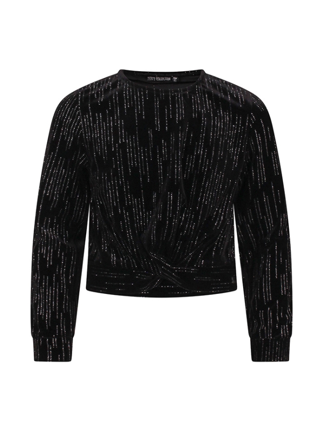 Velvet glitter top voor meisjes met een geknoopt detail. Combineer hem met de bijpassende flared broek (W10525) of draag hem op een jeans voor een stoere look tijdens de feestdagen.