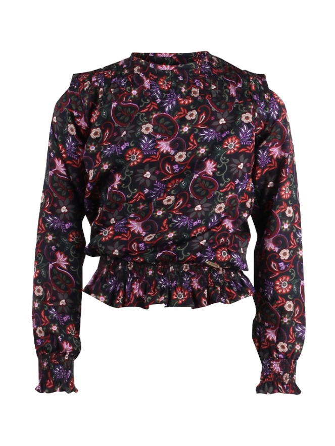 Blouse met lange mouw van Persival. De blouse heeft een all over paisley/bloem print en is aan de onderkant gesmocked. Materiaal: 100% polyester. Wassen op 30 graden, niet bleken, niet in de droger, kan gestreken worden.