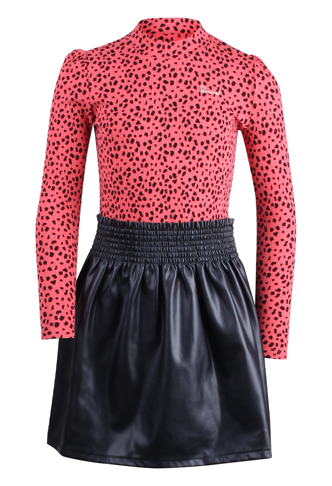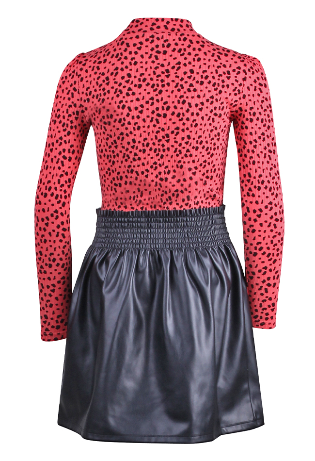 Jurk van Persival. De jurk heeft een PU rok met een smock taille en een rib top met vlekjes. Materiaal: 95% katoen, 5% elasthan, rok: 100% polyrethaan. Wassen op 30 graden, niet bleken, niet in de droger, kan gestreken worden.