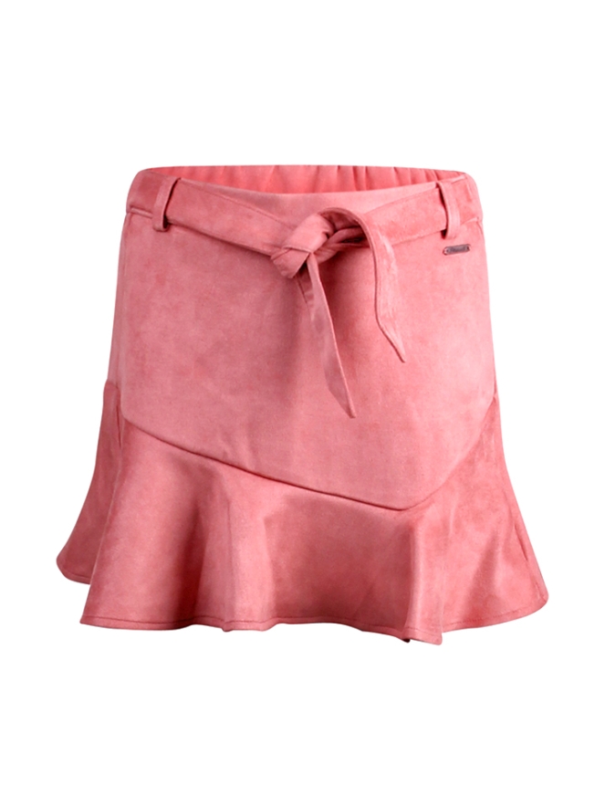 Suede rokje van Persival. Het rokje loopt uit en heeft een strik riem in de taille. Materiaal: 95% polyester, 5% elasthan. Wassen op 30 graden, niet bleken, niet in de droger, kan gestreken worden.
