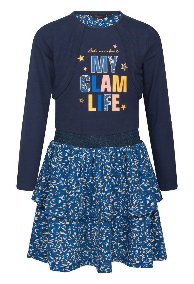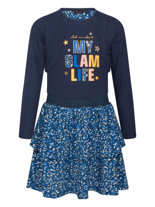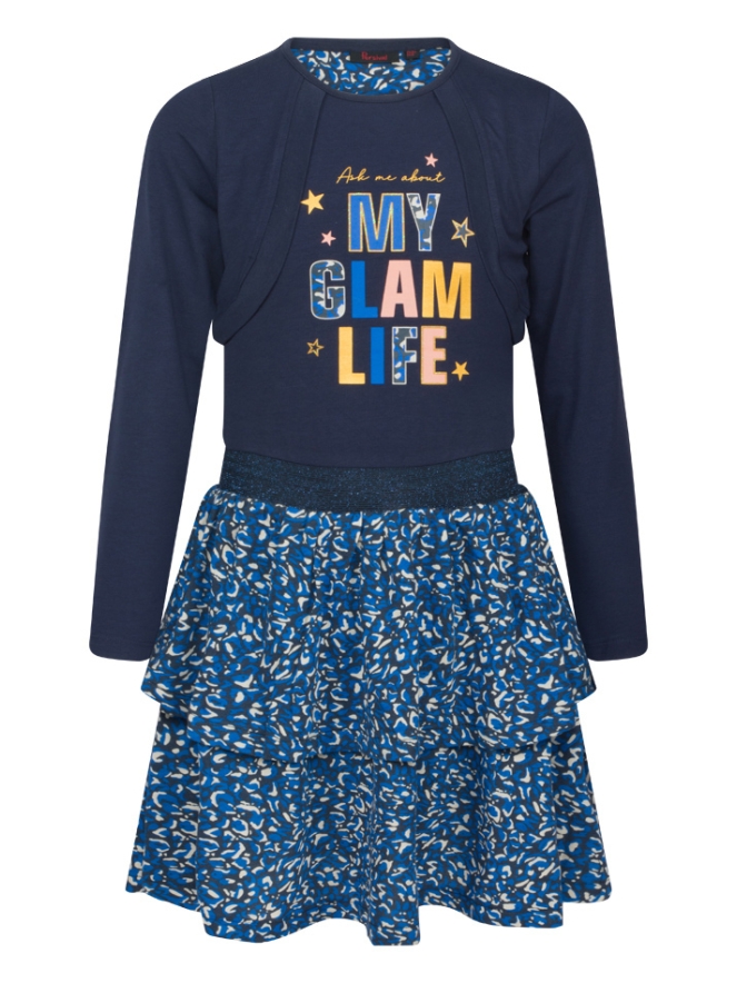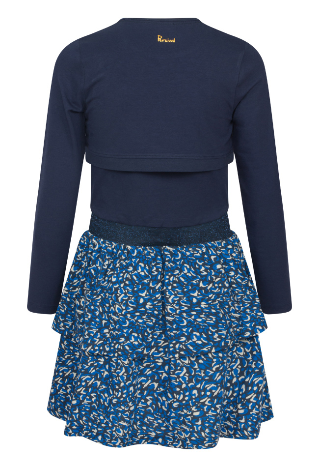 Jurk van Persival. De jurk heeft een effen top met een tekst en een nep vestje er over. Het rokje is een stroken rok met print. Er zit een elastieken taille band in. Materiaal: 65% polyester, 30% katoen, 5% elasthan. Wassen op 30 graden, niet bleken, niet in de droger, kan gestreken worden.