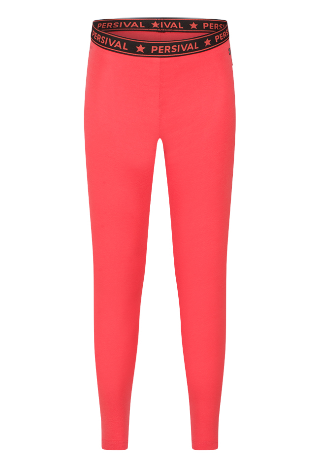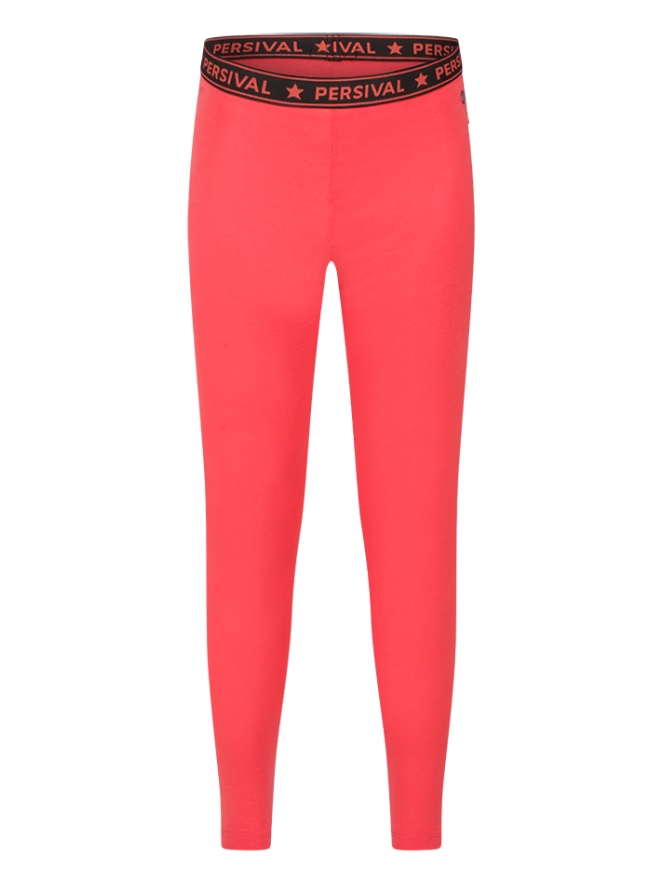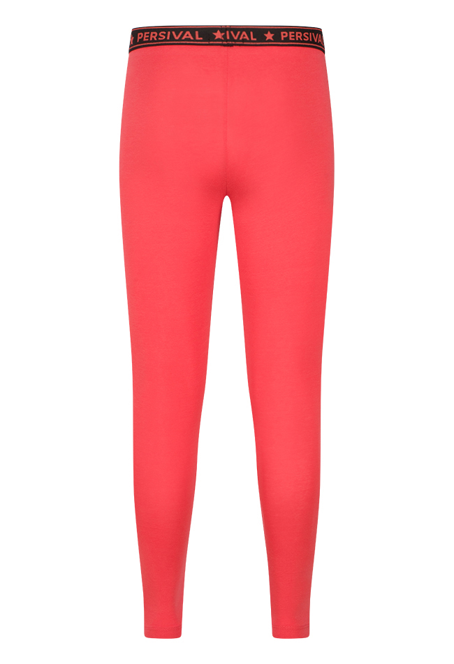 Legging van Persival. De legging heeft een lange lengte en een tekst taille band. Materiaal: 95% katoen, 5% elasthan. Wassen op 30 graden, niet bleken, niet in de droger, kan gestreken worden.