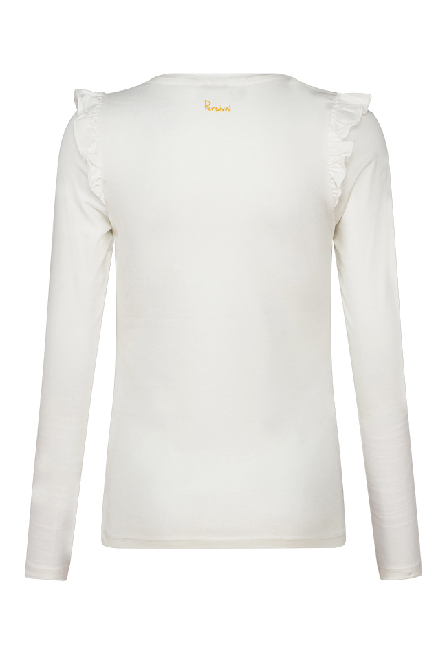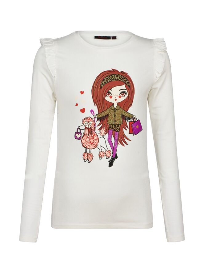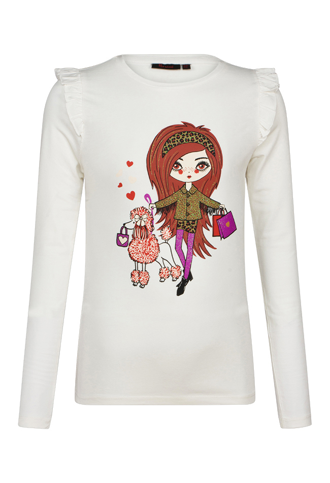 T-shirt lange mouw van Persval. Het t-shirt heeft een print op de voorkant van een meisje met hond.Er zit ruche op de schouders. Materiaal: 65% polyester, 30% katoen, 5% elasthan. Wassen op 30 graden, niet bleken, niet in de droger, kan gestreken worden.
