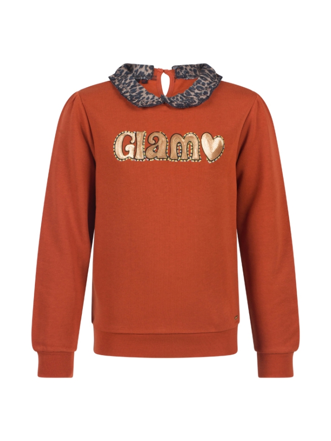 Trui van Persival. De trui heeft een animal print kraagje en sequin tekst op de voorkant. Materiaal: 60% katoen, 40% polyester. Wassen op 30 graden, niet bleken, niet in de droger, kan gestreken worden.