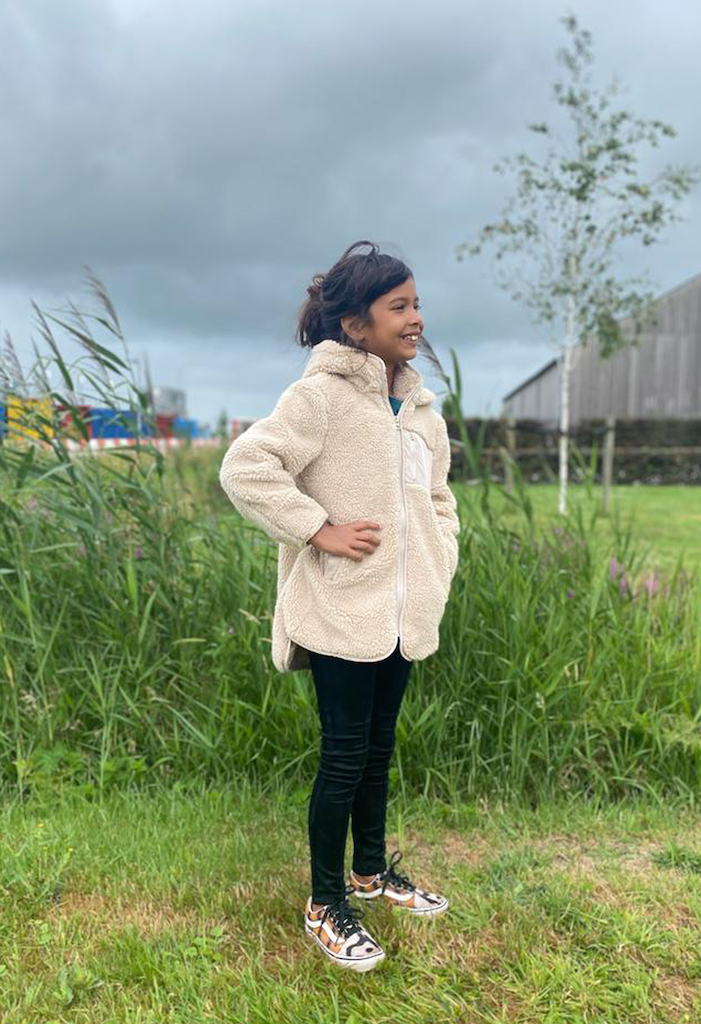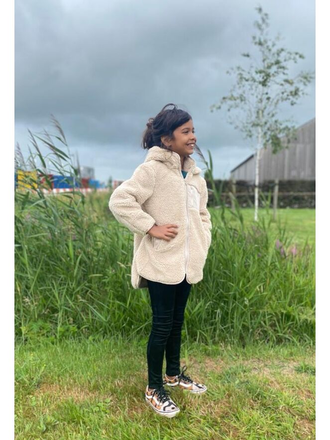 Teddy tussen jas van Persival. De jas heeft een capuchon met een zakje op borst. De buitenstof is teddy en de binnenkant van gladde panter print stof. Materiaal: 100% polyester. Wassen op 30 graden, niet bleken, niet in de droger, kan gestreken worden.