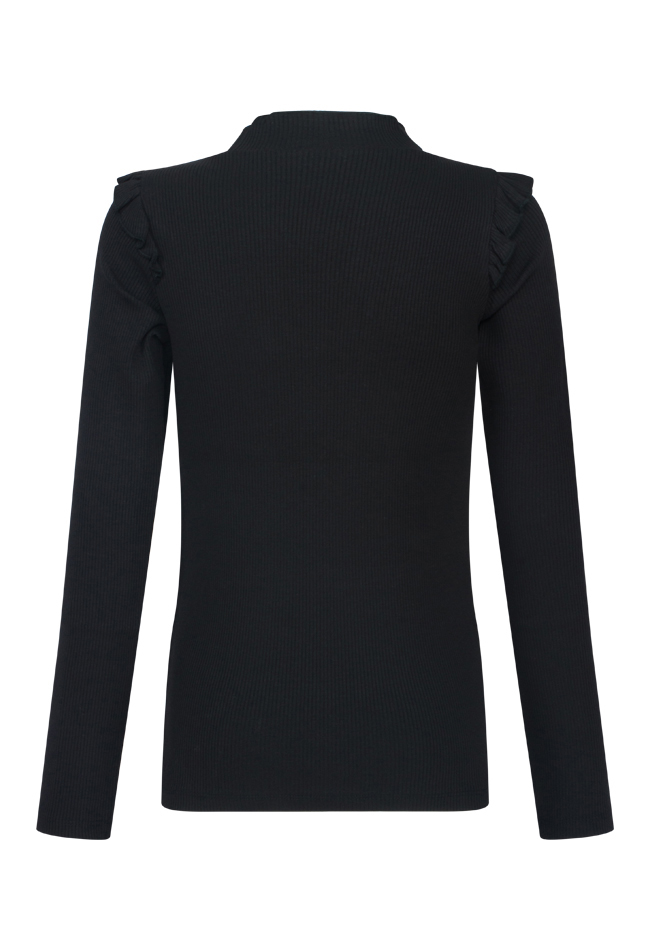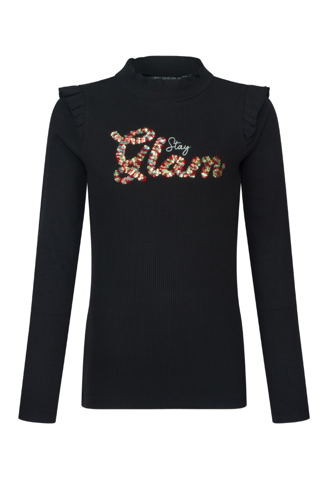 Rib t-shirt van Persival. Het t-shirt heeft een sequin tekst op de voorkant en ruche op de schouders. Materiaal: 95% katoen, 5% elasthan. Wassen op 30 graden, niet bleken, niet in de droger, kan gestreken worden.