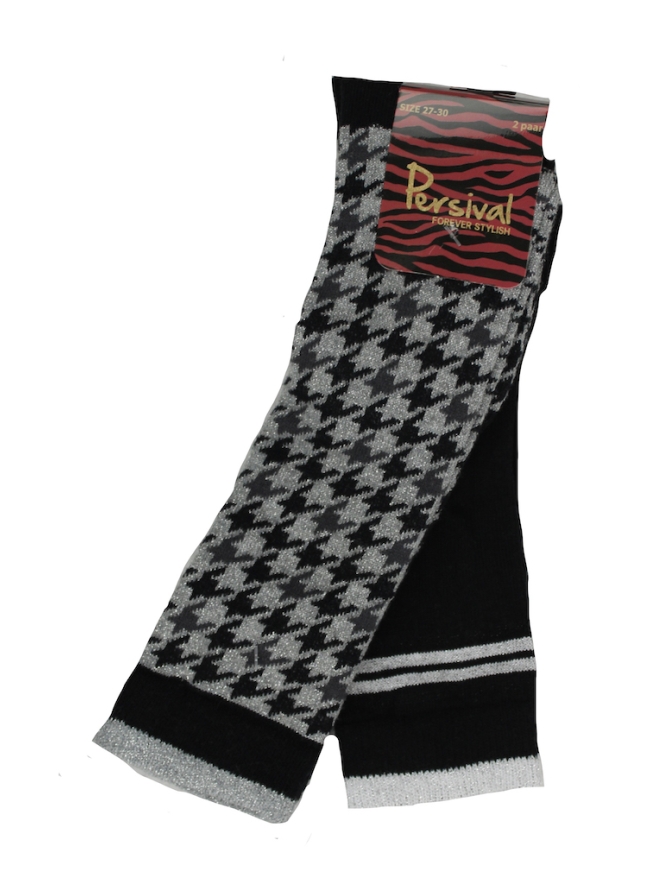 2 paar knie kousen. 1 paar geruit en een paar effen met een glitter baan. Materiaal: 78% katoen, 20% polyamide, 2% elasthan. Wassen op 30 graden, niet bleken, niet in de droger.