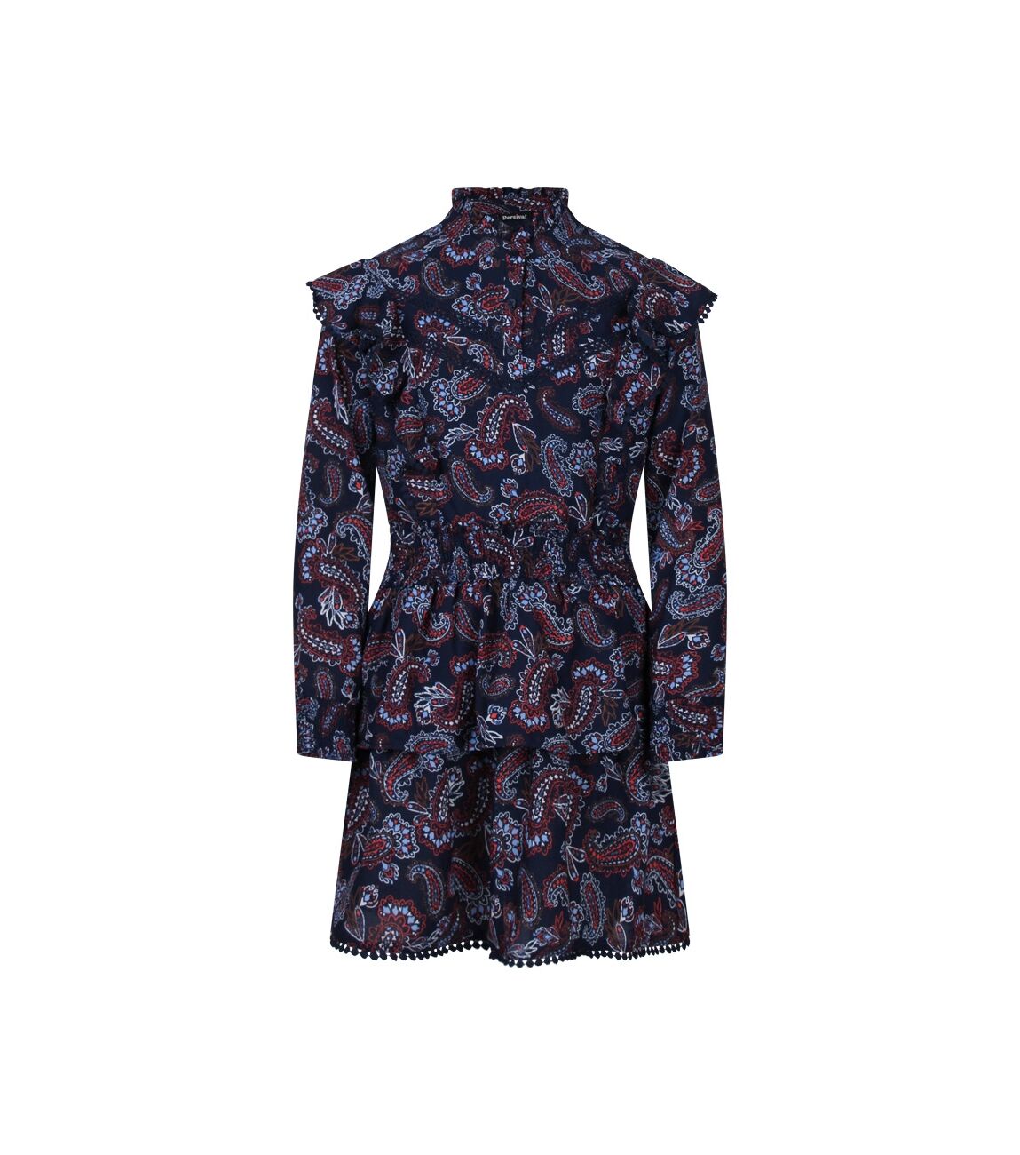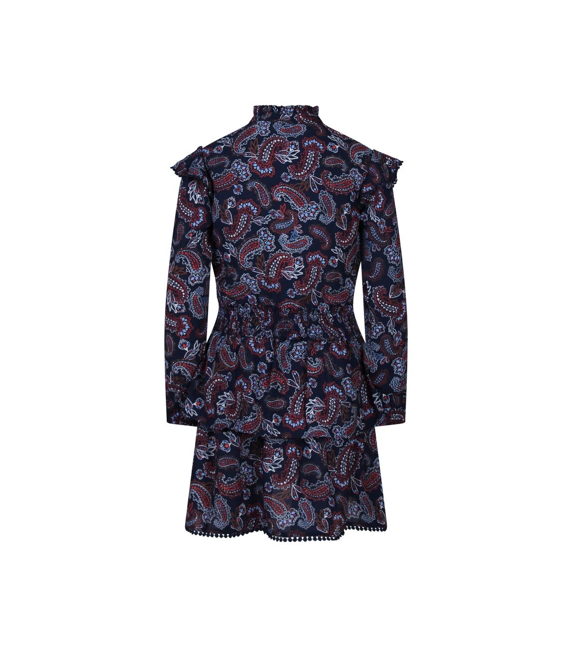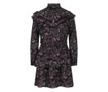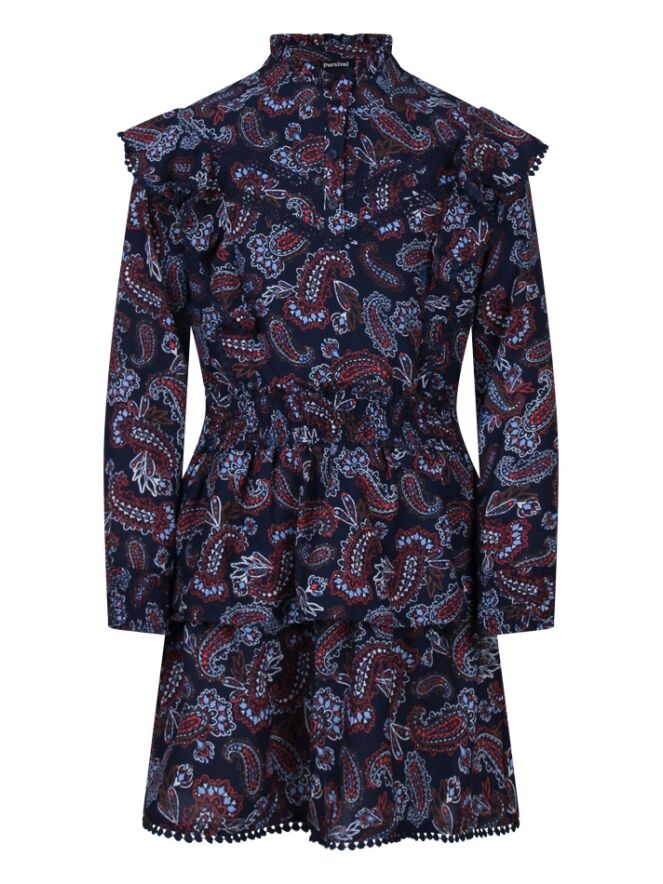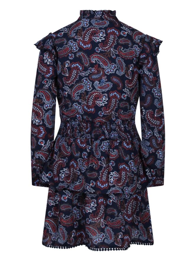 Jurk met all-over paisley print, lange mouwen en opstaan kraagje met roezel rand. De bovenkant wordt aan de voorkant gesloten met 3 knoopjes. Op de schouders en over het voorpand loopt een roedel rand met bollentjes kant als afwerking. De taille en onderkant van de mouwen zijn gemaakt van smockband. Onder aan de stroken rok zit een een kanten bollentjes rand als afwerking. De rod is voorzien van een onderrok.