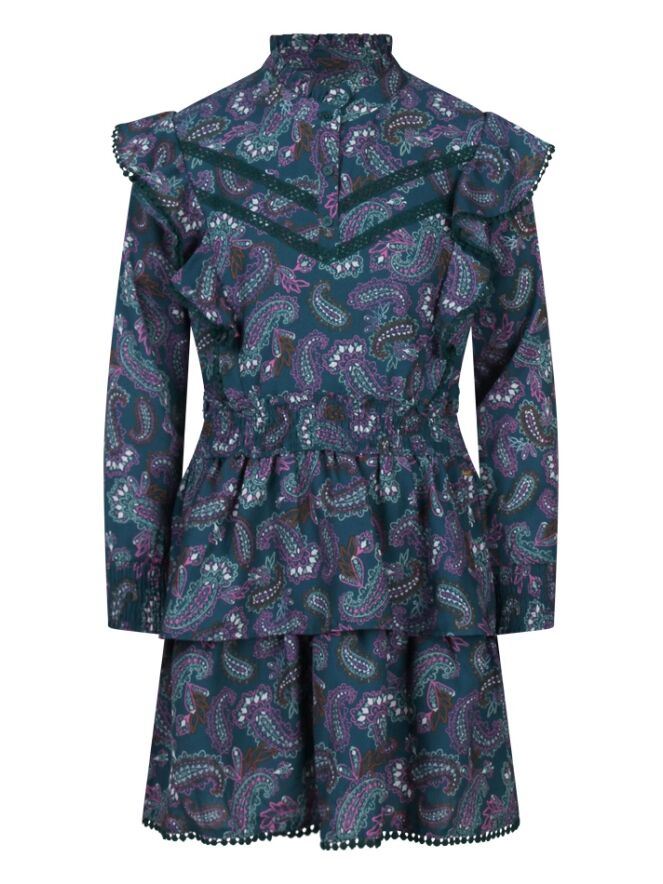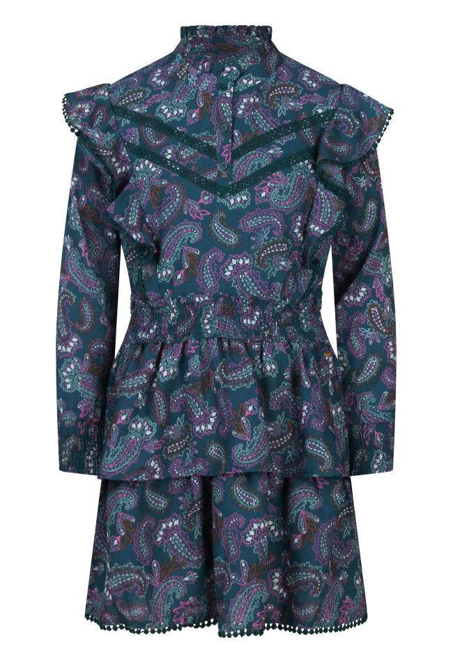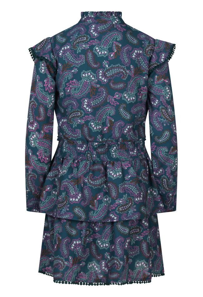 Jurk met all-over paisley print, lange mouwen en opstaan kraagje met roezel rand. De bovenkant wordt aan de voorkant gesloten met 3 knoopjes. Op de schouders en over het voorpand loopt een roedel rand met bollentjes kant als afwerking. De taille en onderkant van de mouwen zijn gemaakt van smockband. Onder aan de stroken rok zit een een kanten bollentjes rand als afwerking. De rod is voorzien van een onderrok.