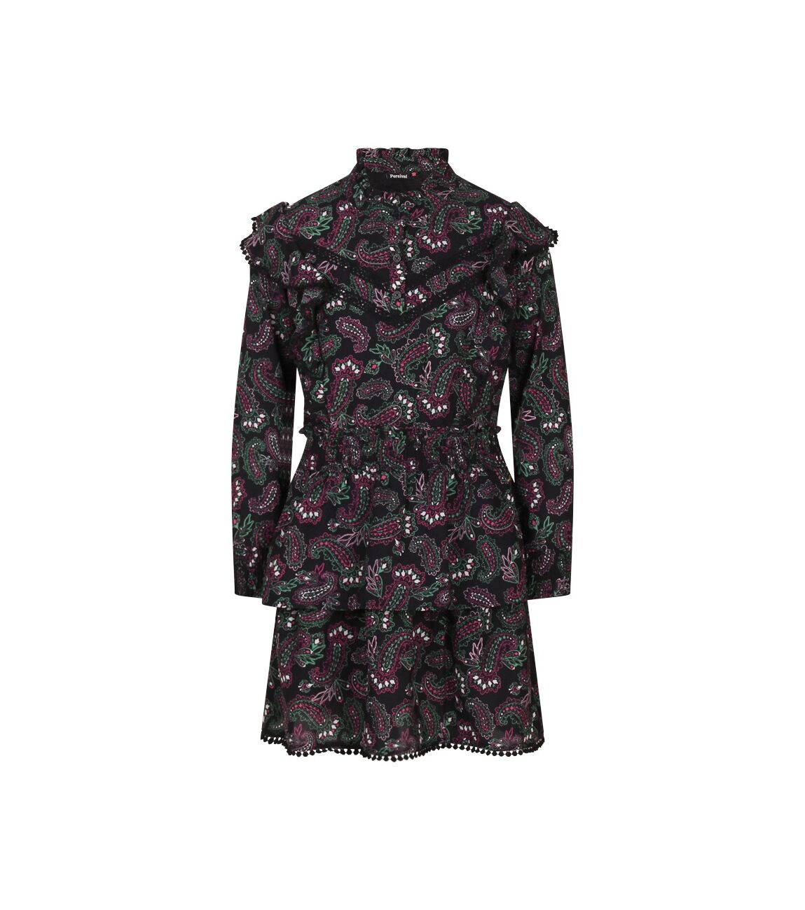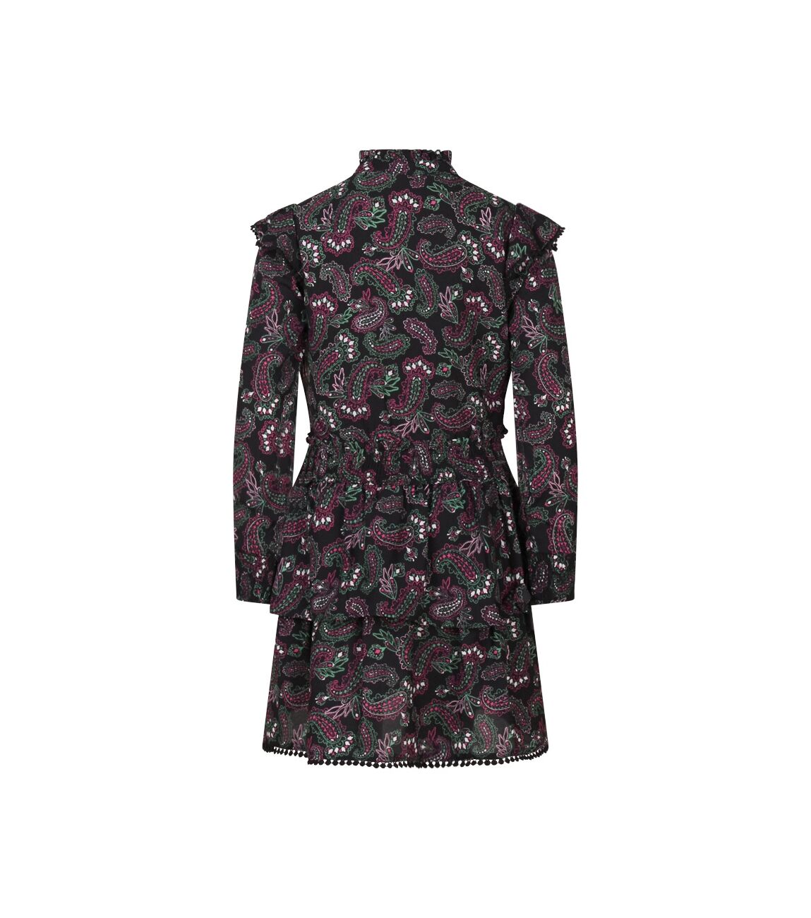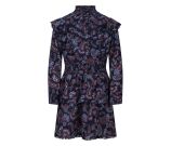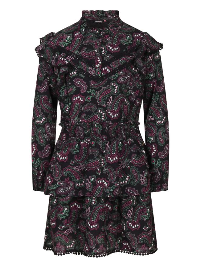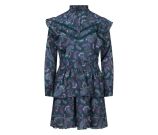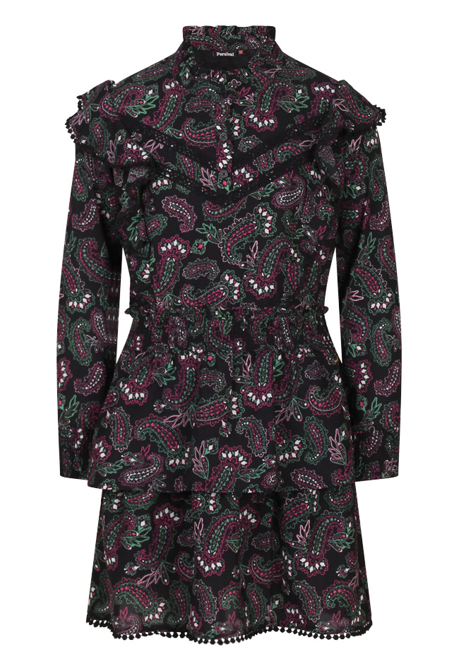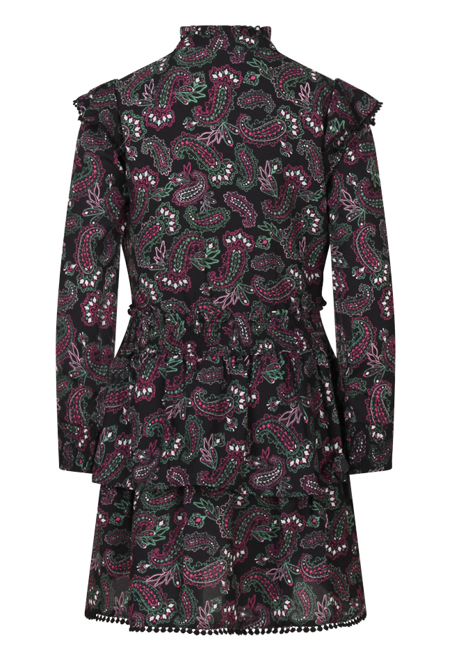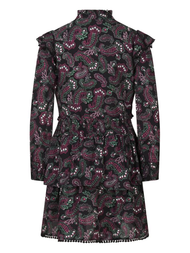 Jurk met all-over paisley print, lange mouwen en opstaan kraagje met roezel rand. De bovenkant wordt aan de voorkant gesloten met 3 knoopjes. Op de schouders en over het voorpand loopt een roedel rand met bollentjes kant als afwerking. De taille en onderkant van de mouwen zijn gemaakt van smockband. Onder aan de stroken rok zit een een kanten bollentjes rand als afwerking. De rod is voorzien van een onderrok.