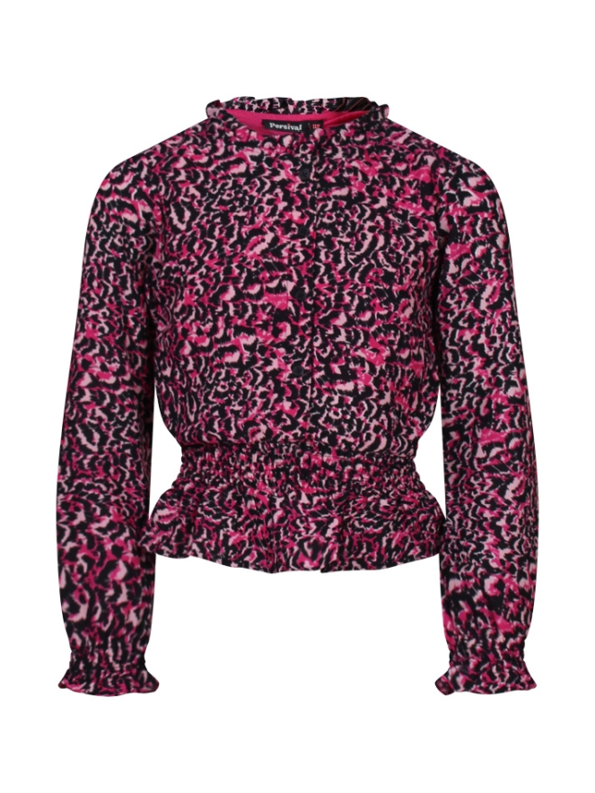 Ontdek deze modieuze blouse met all-over panterprint, stijlvolle pofmouwen en smockbanddetails. Het roesrandje rond de hals voegt een speels element toe.