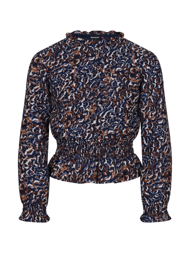 Ontdek deze modieuze blouse met all-over panterprint, stijlvolle pofmouwen en smockbanddetails. Het roesrandje rond de hals voegt een speels element toe.