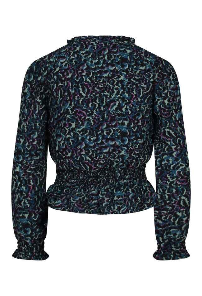 Ontdek deze modieuze blouse met all-over panterprint, stijlvolle pofmouwen en smockbanddetails. Het roesrandje rond de hals voegt een speels element toe.