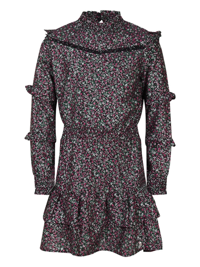 Dit charmante jurkje met lange mouwen heeft een prachtige bloemenprint. Het heeft een elastische taille en elastische uiteinden van de mouwen voor een comfortabele pasvorm. De rok heeft speelse laagjes. Het opstaande kraagje is eveneens elastisch.
