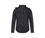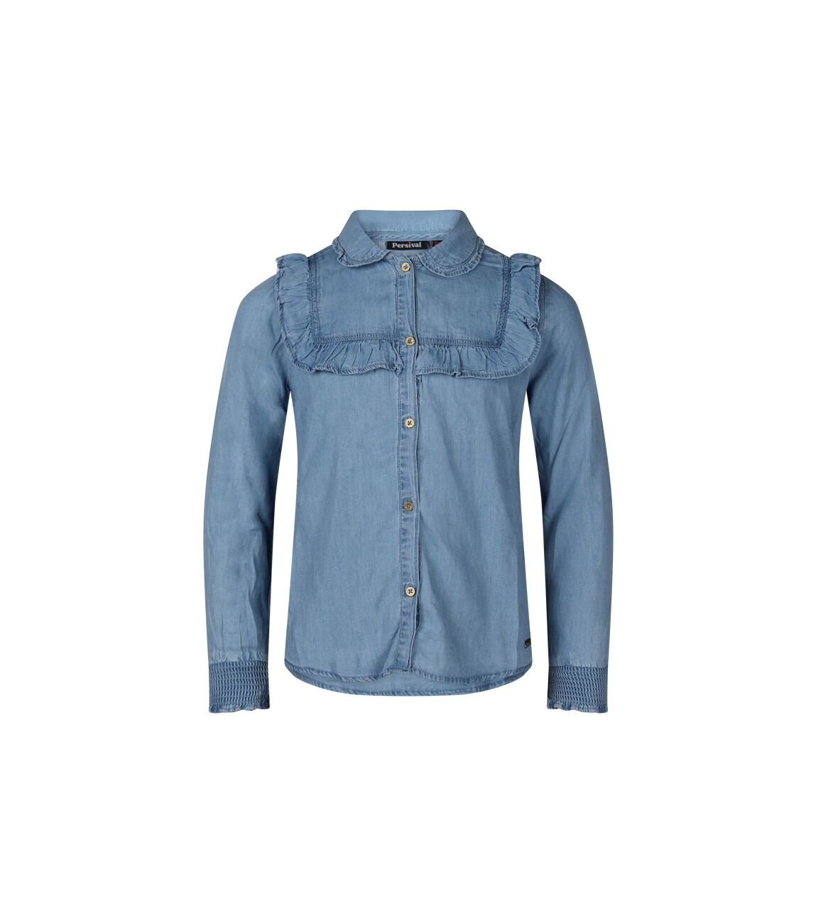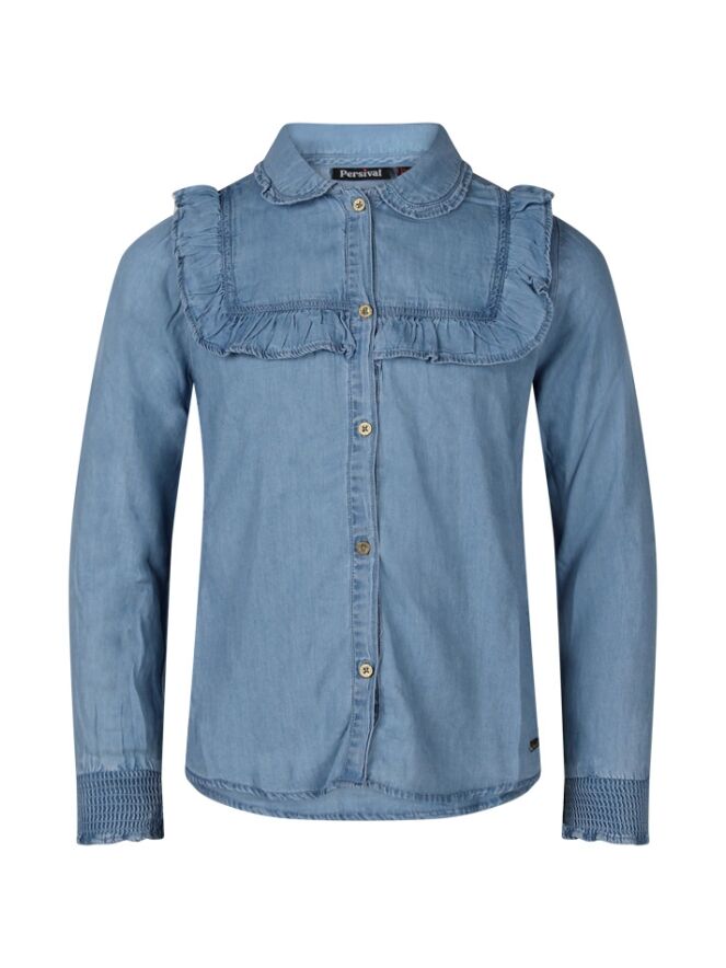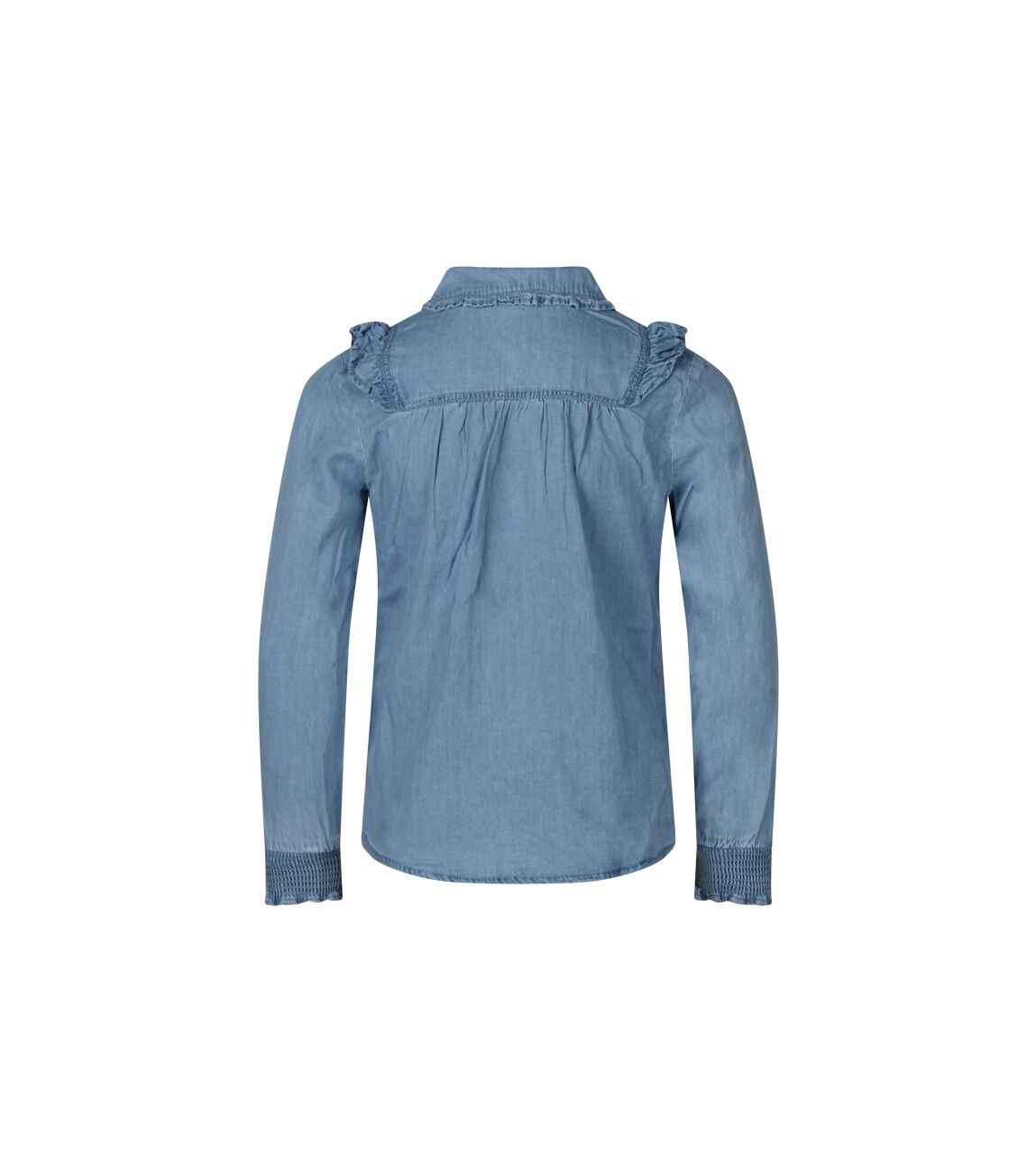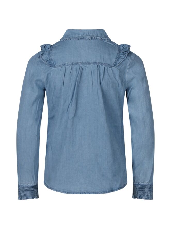Denim blouse met ruches over het voorpand en de schouders. De jurk heeft een kraag met ruche randje en wordt aan de voorkant gesloten met knopen. Onder aan de mouwen zit een elastische smockboord.
