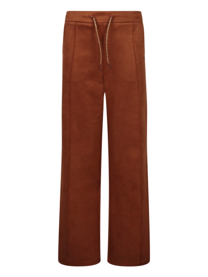Wijde suèdine pantalon met decoratieve naden over het voorpand en steekzakken. De tailleband heeft aan de achterkant een elastische inzet voor een comfortabele en nauwsluitende pasvorm, de voorkant is verstelbaar met een glitter koord. Op het achterpand zitten twee sier strookzakken. Attentie: Dit materiaal kan kleur afgeven. Let op met lichte meubelstukken en lichte kleding. Was met gelijke kleuren om afgeven te voorkomen.