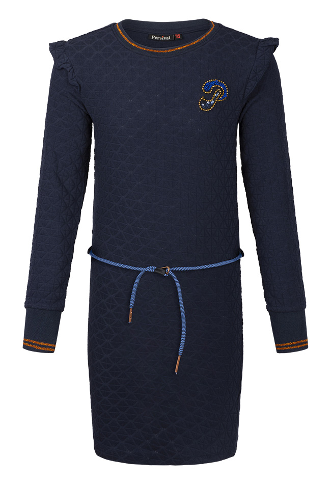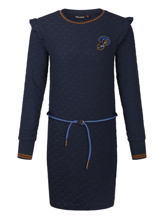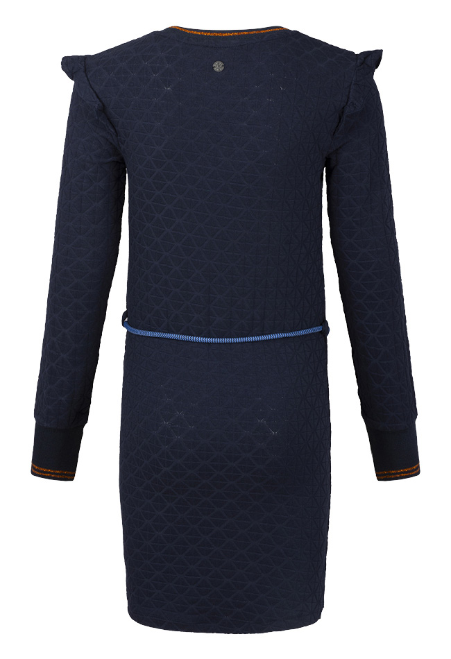Een jersey jurk met een geruit reliëfpatroon in de stof. Deze jurk heeft een ronde hals, lange mouwen met glinsterende boorden en een ceintuurkoord om de taille. Op de borst bevindt zich een letter applicatie met glanzende steentjes.