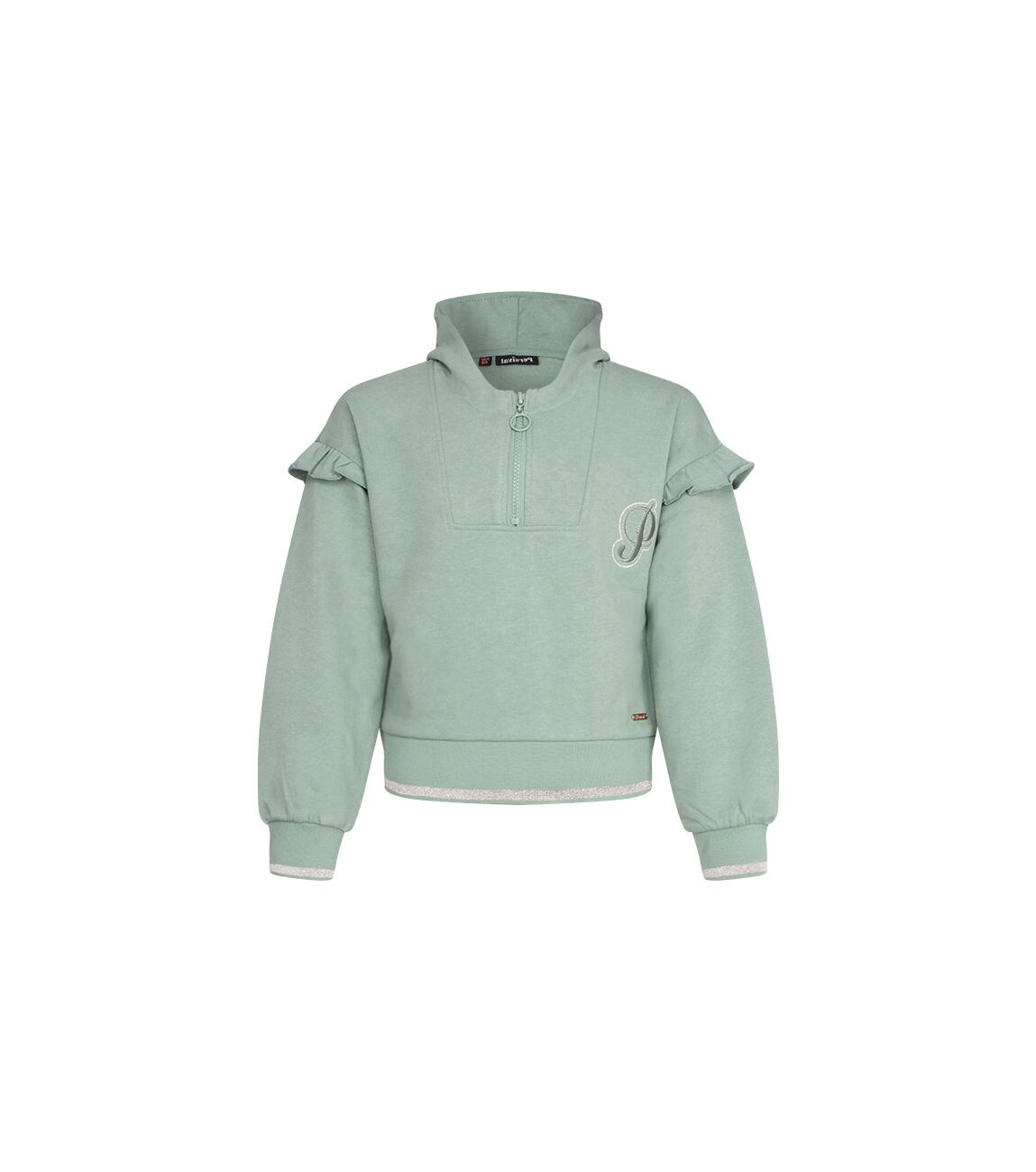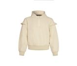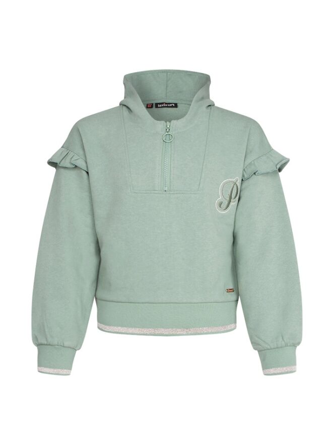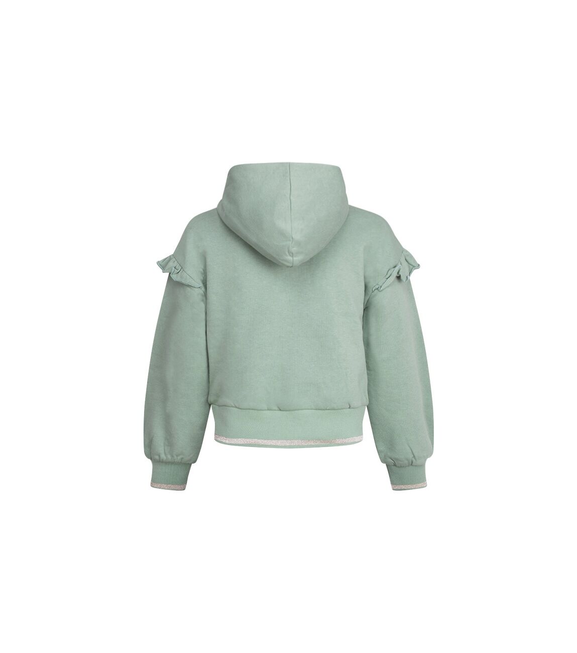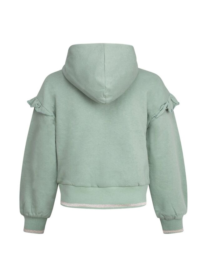 Sweater hoody met capuchon. Ruches op de schouder en boorden met een glittertje bij de mouw en onderlangs bij de taille.