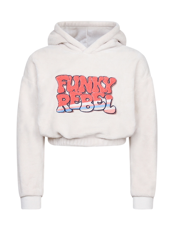 Deze super zachte meisjes trui is een kort model met voorop de tekst Funky rebel. Met capuchon.