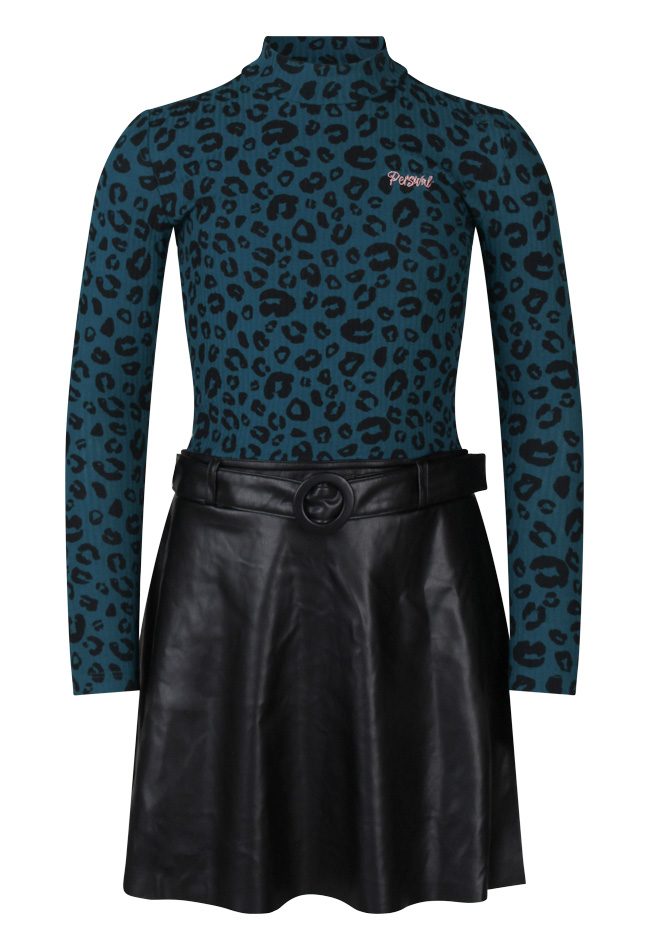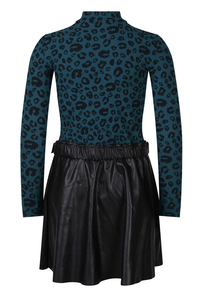 Jurk met lange mouwen en een turtleneck. Het bovenstuk is gemaakt van een grovere ribstof met een panterprint, de taille is voorzien van een sier imitatie leren riem. De A-lijn rok is gemaakt van imitatie leer, wat deze jurk perfect maakt voor jonge fashionista's. Attentie: Dit materiaal kan kleur afgeven. Let op met lichte meubelstukken en lichte kleding. Was met gelijke kleuren om afgeven te voorkomen.