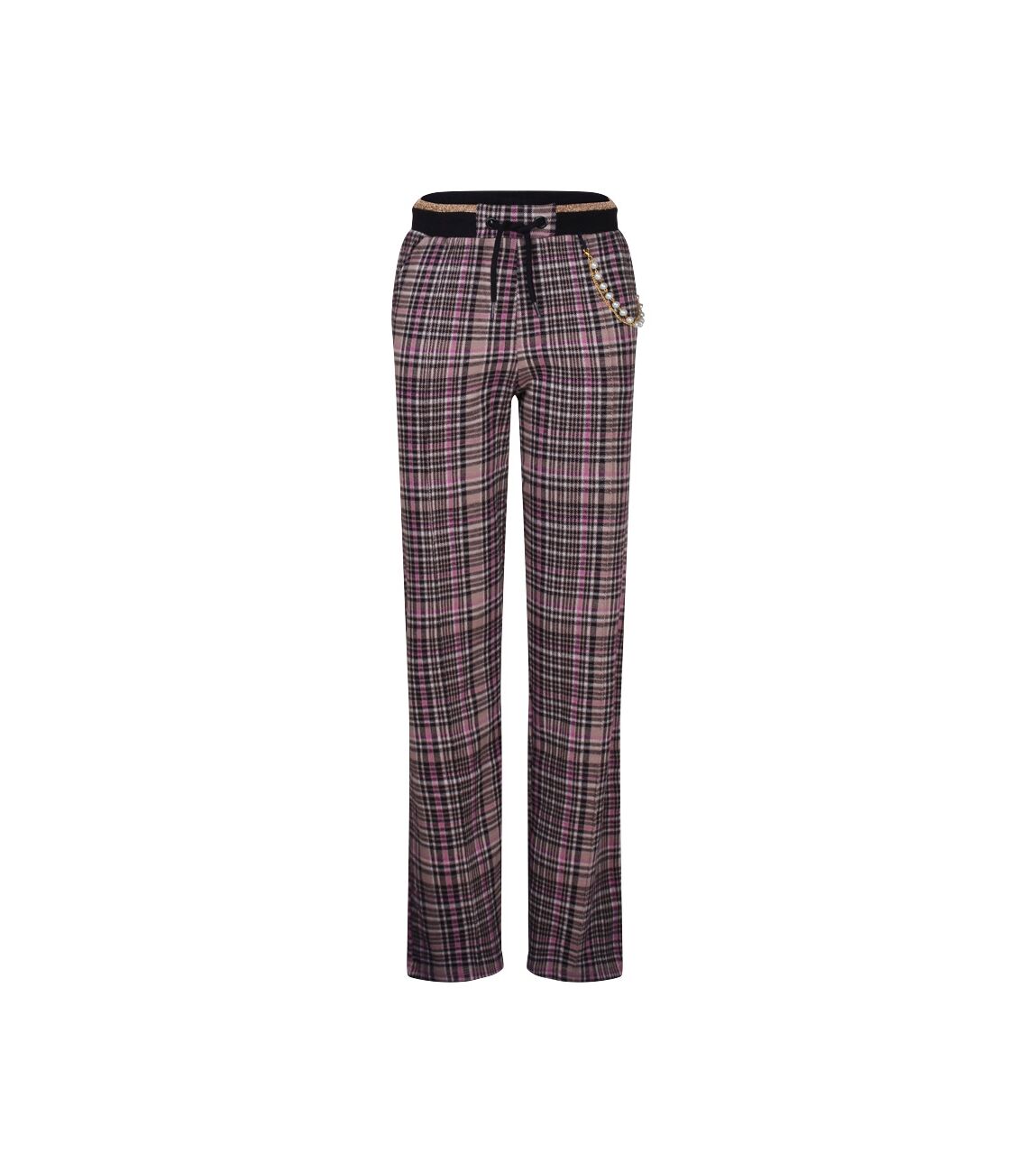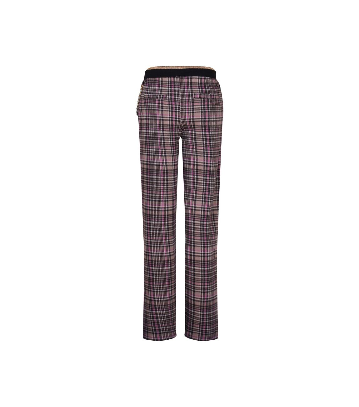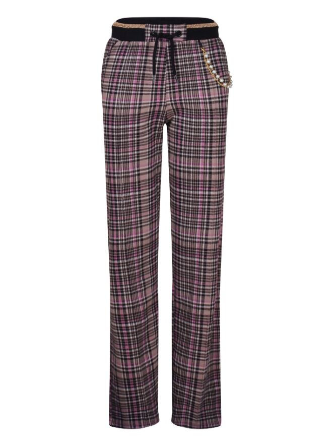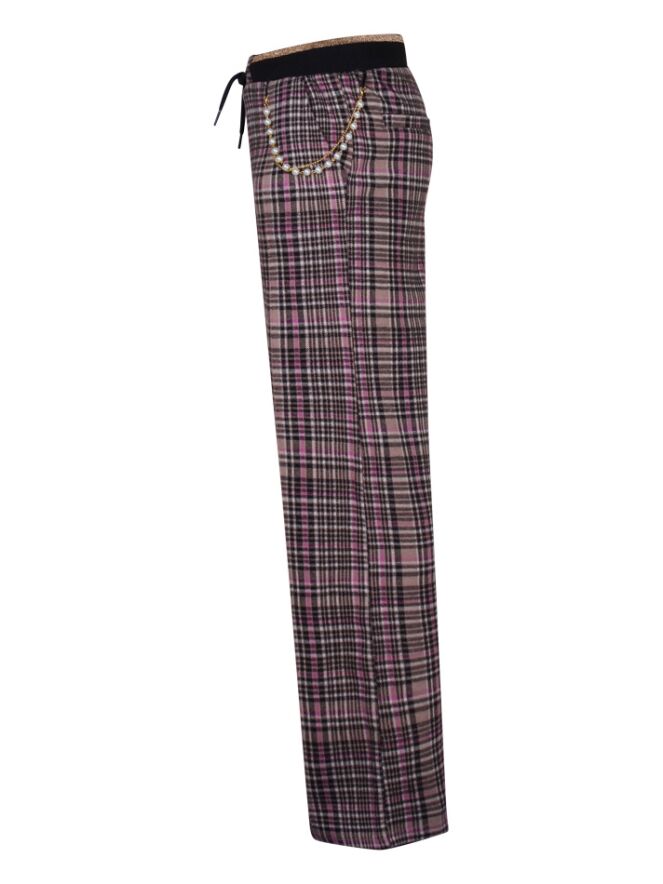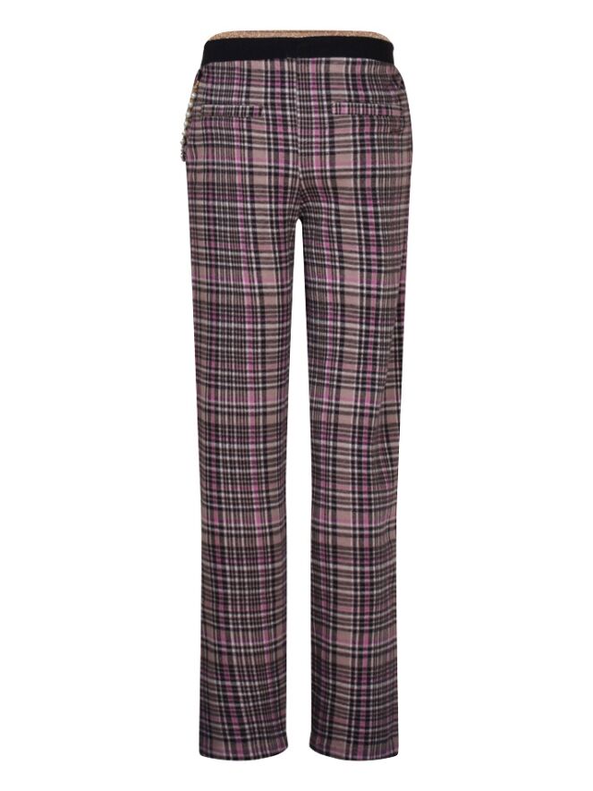 Geruite broek met twee steekzakken en twee sierzakken op de achterkant. De tailleband is elastisch met koord. Met afneembaar sierkoord. Deze broek is een recht model.