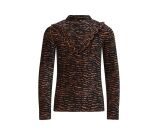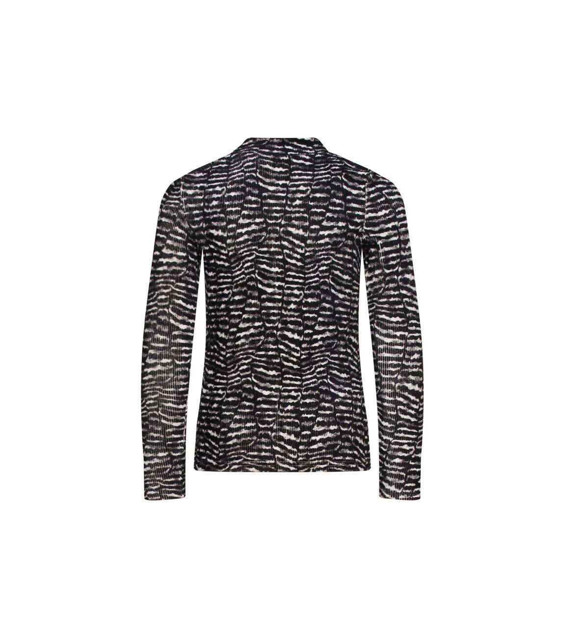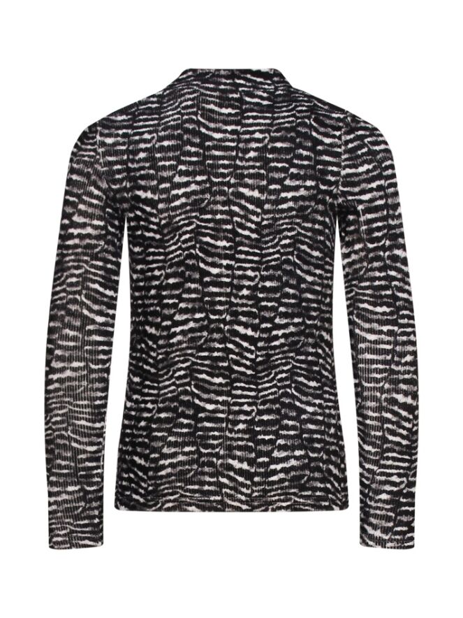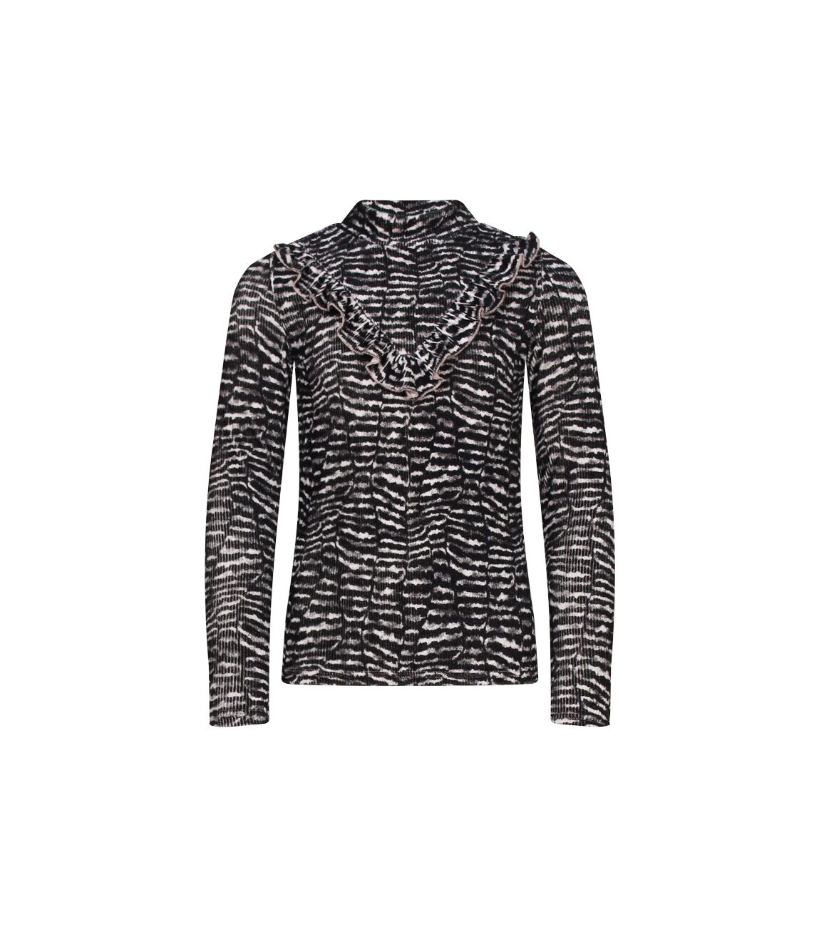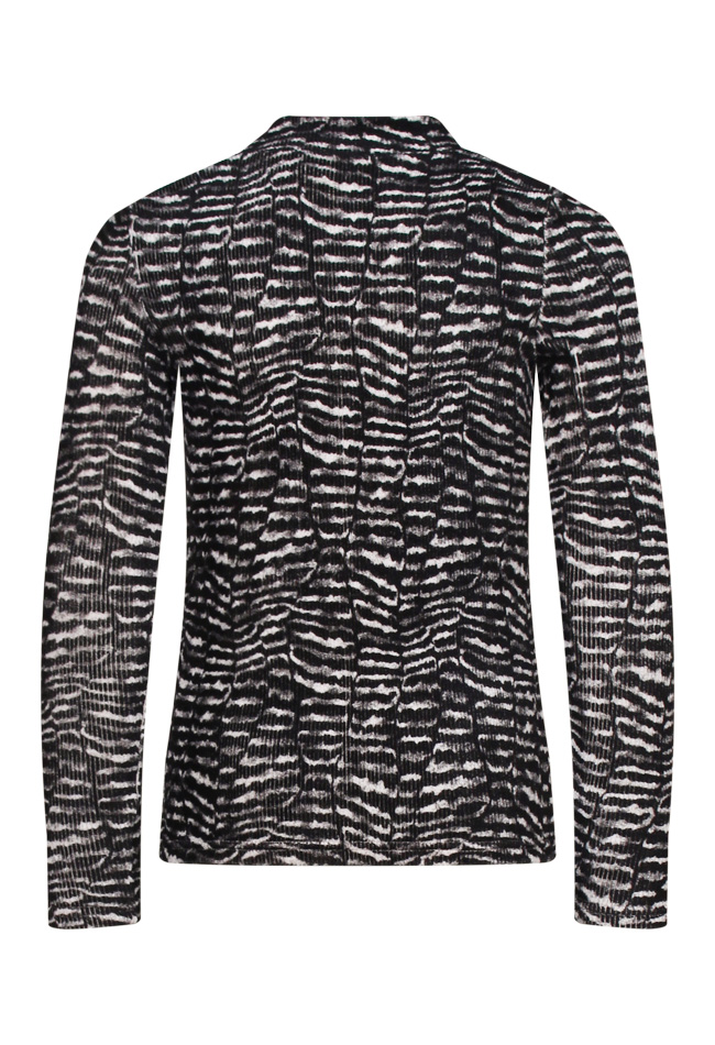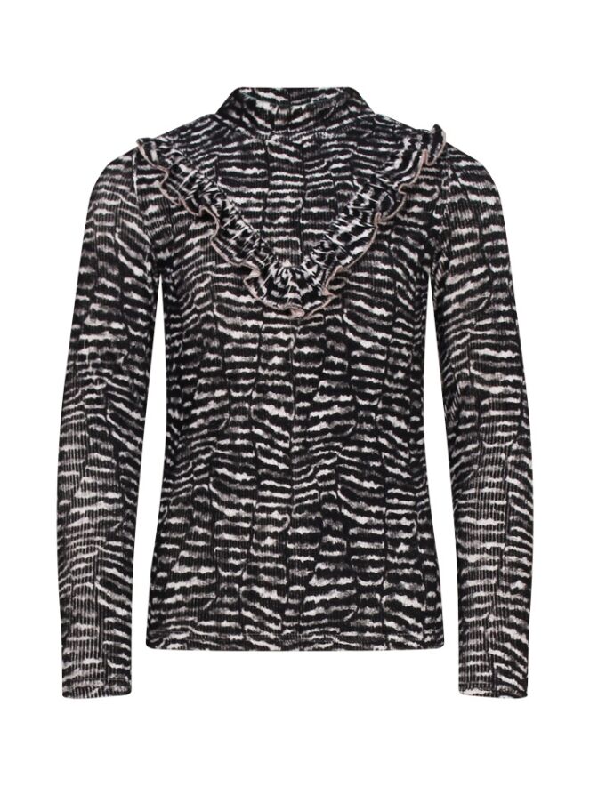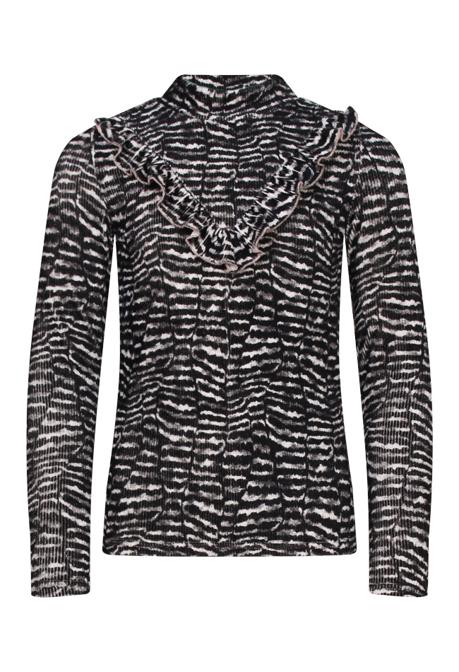 T-shirt met lange mouw met ruche in v-vorm gemaakt van een rib velours met zebra print. Leuk te combineren met bijpassende broek W80097.